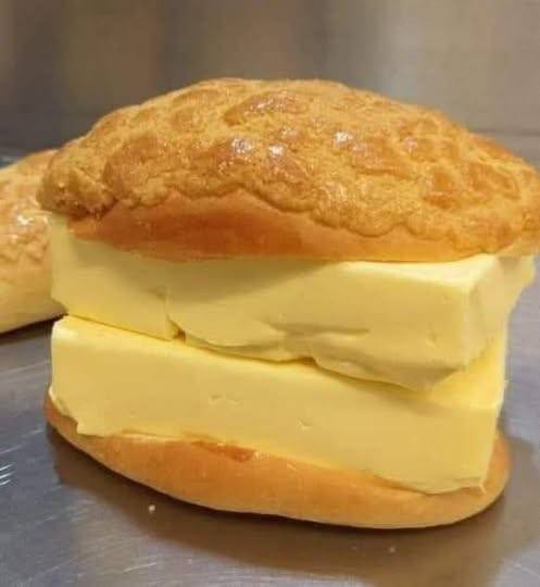 網上fb群組最新流傳一張網民晒圖,顯示一個正常體積的傳統菠蘿包,卻不尋常地夾著幾吋厚的牛油,形成一個超巨型「菠蘿油」,十分誇張。