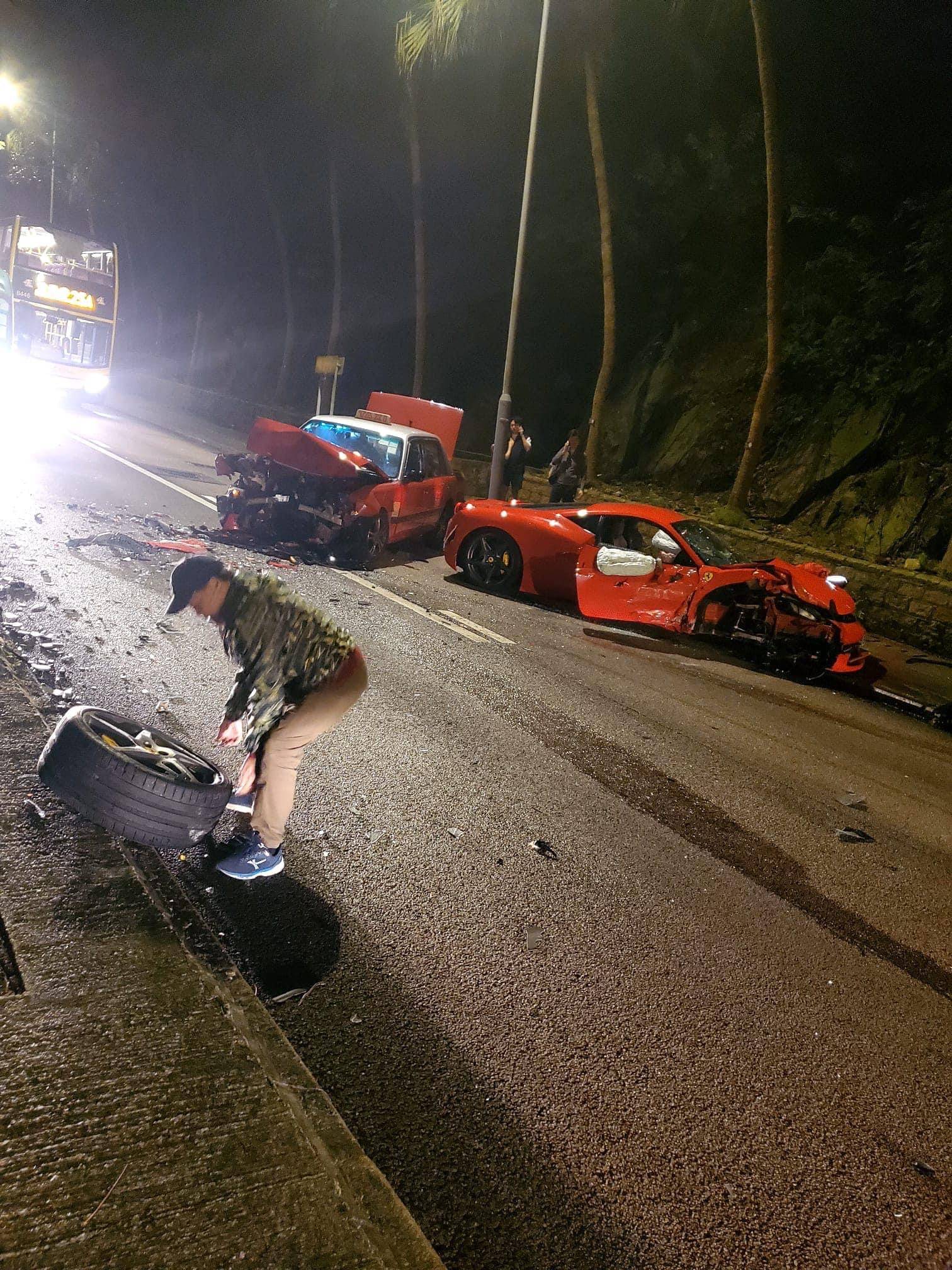 根據網上圖片所見,兩車車頭嚴重損毀、零件四散,法拉利右邊車轆飛脫,跌在馬路近人路位置,一男子嘗試拾回。