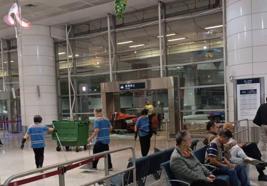 周一(11月25日),一輛紅色的士駛入機鐵的士站時,懷疑失控撞向玻璃牆。