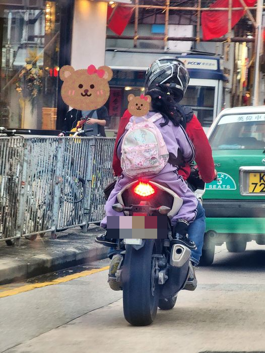 日前一張電單車載女童照片在網上掀熱議。網上流傳相片中,可見一名鐵騎士正駕駛電單車,並載着一名年幼女童行駛,但仔細看,坐於後座的女童未有配戴頭盔,便伏於司機背上及手抱其腰,亦未見其他安全措施,情況勁危險。