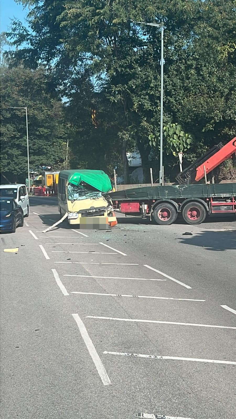 上水文錦渡路發生交通意外。今早9時35分,一輛綠Van專線小巴,於文錦渡近缸瓦甫路、路虎地坳沙嶺附近,與一部吊臂車相撞。據網上照片可見,小巴車頭嚴重損毀,擋風玻璃亦甩脫。