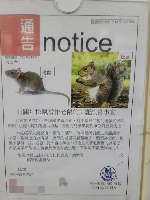 一名網民在社交平台群組發布一張公告照片,寫道「邊位上水太平邨居民咁高智能,松鼠當做老鼠…」,仔細看,公告上寫有「松鼠當作老鼠的美麗誤會事宜」。據該通告上指出,近日太平邨管理處接獲通知,有不常見品種的老鼠於邨內徘徊、跳躍,更指「老鼠」具有卓越跳躍能力,能輕而易舉攀爬到單位附近及樹上。