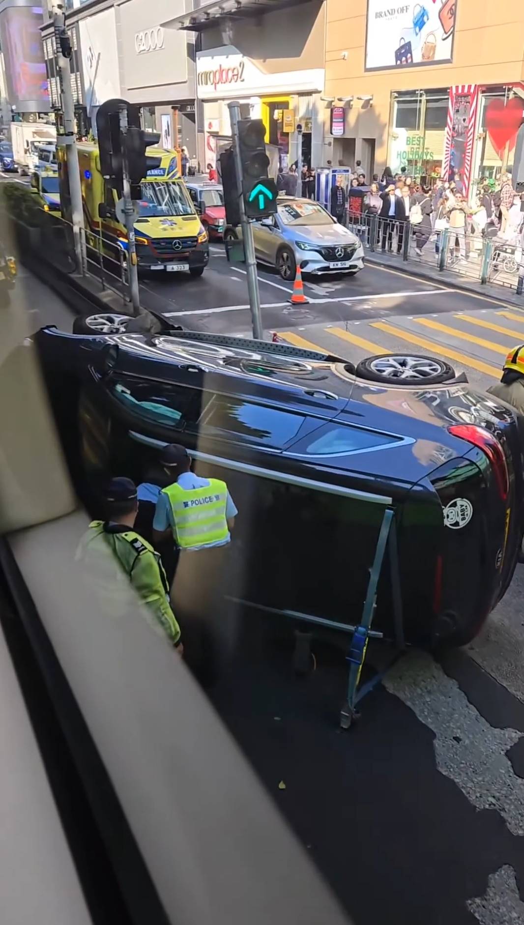 今天下午2時許,一輛車沿尖沙咀彌敦道往海傍方向行駛,當駛至加連威老道附近突然失控撞向燈柱後翻側,司機江若自行爬出車外,由救護車送院治理。從網上fb群組視頻可見,由於車輛於尖沙咀閙市翻側,因此惹來不少途人圍觀。