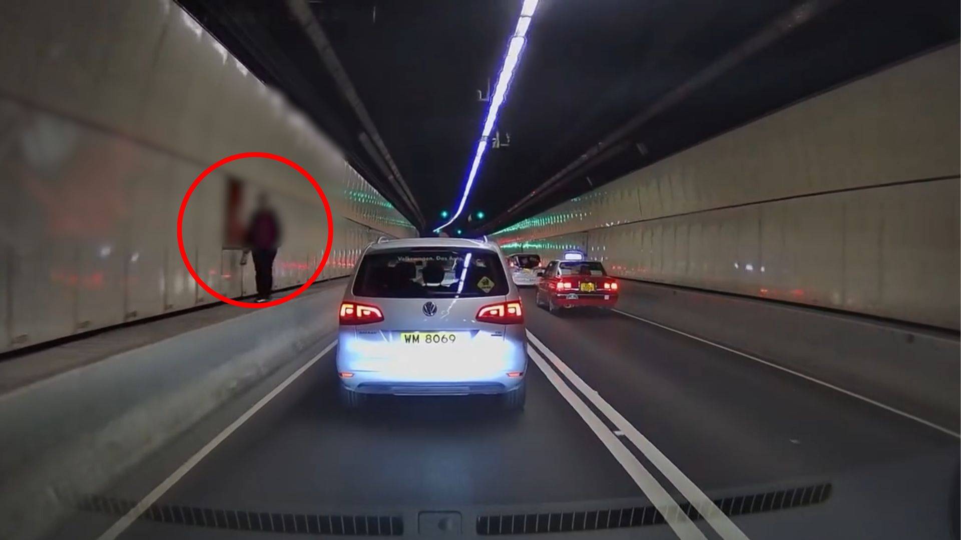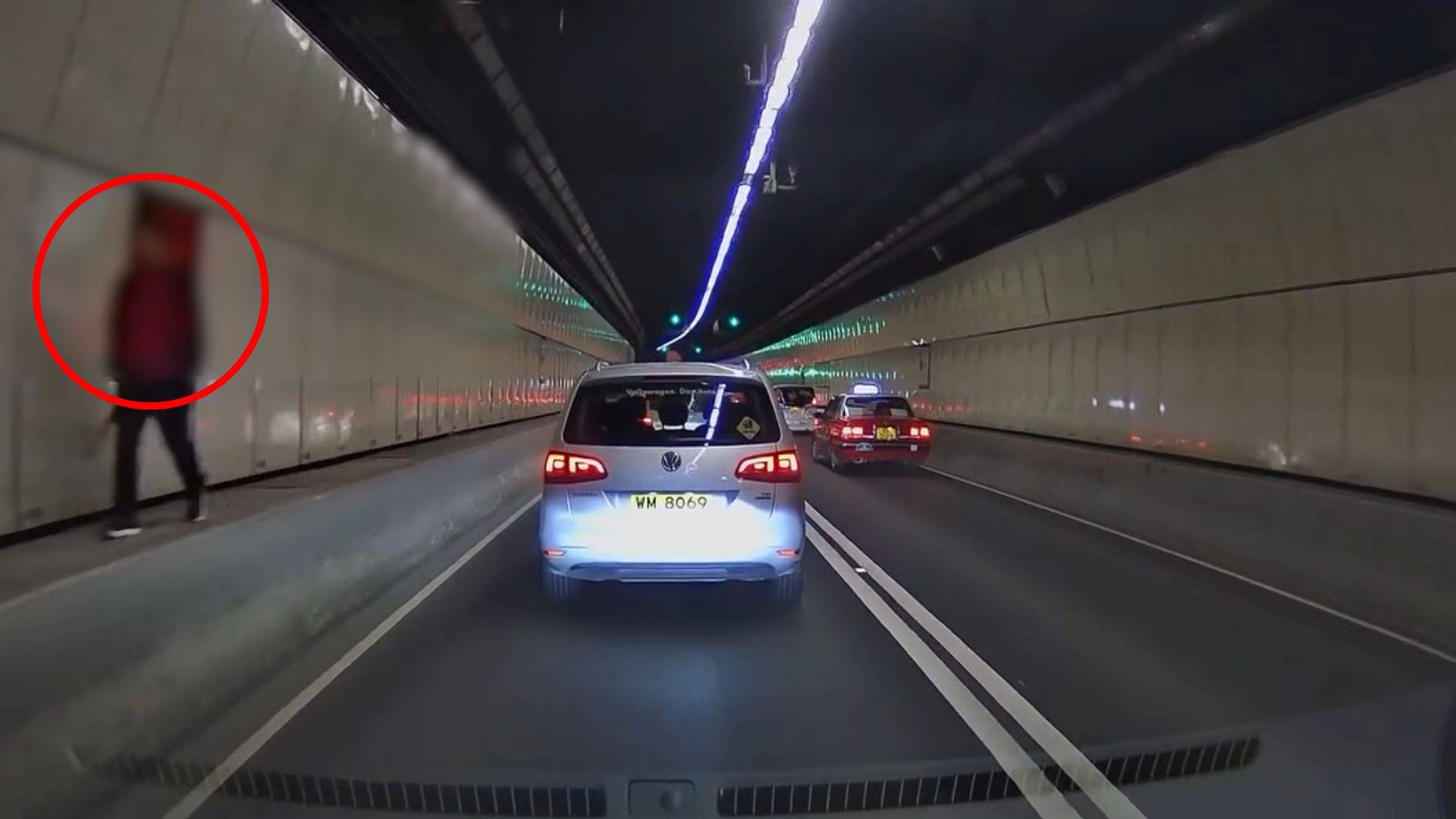 很多市民不清楚,隧道內其實是不准進入的!網上近日瘋傳一則影片,有車主在行車隧道內駕駛前進時,突然左方有一名男子出現,並行走於隧道內,惟暫未知道事發隧道位置。而上載影片的車主則表示,「傻人發現案」。
