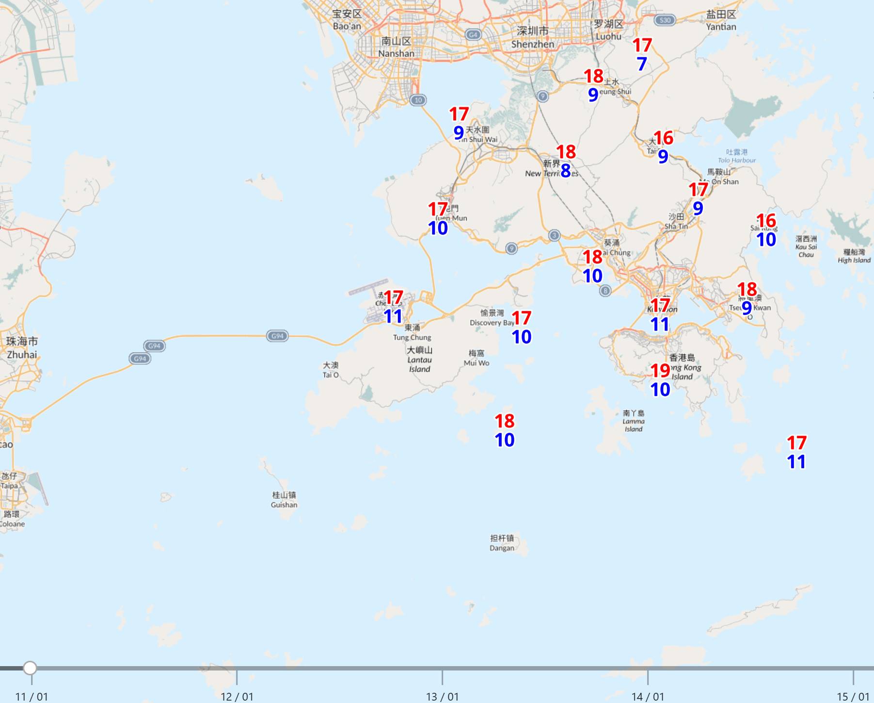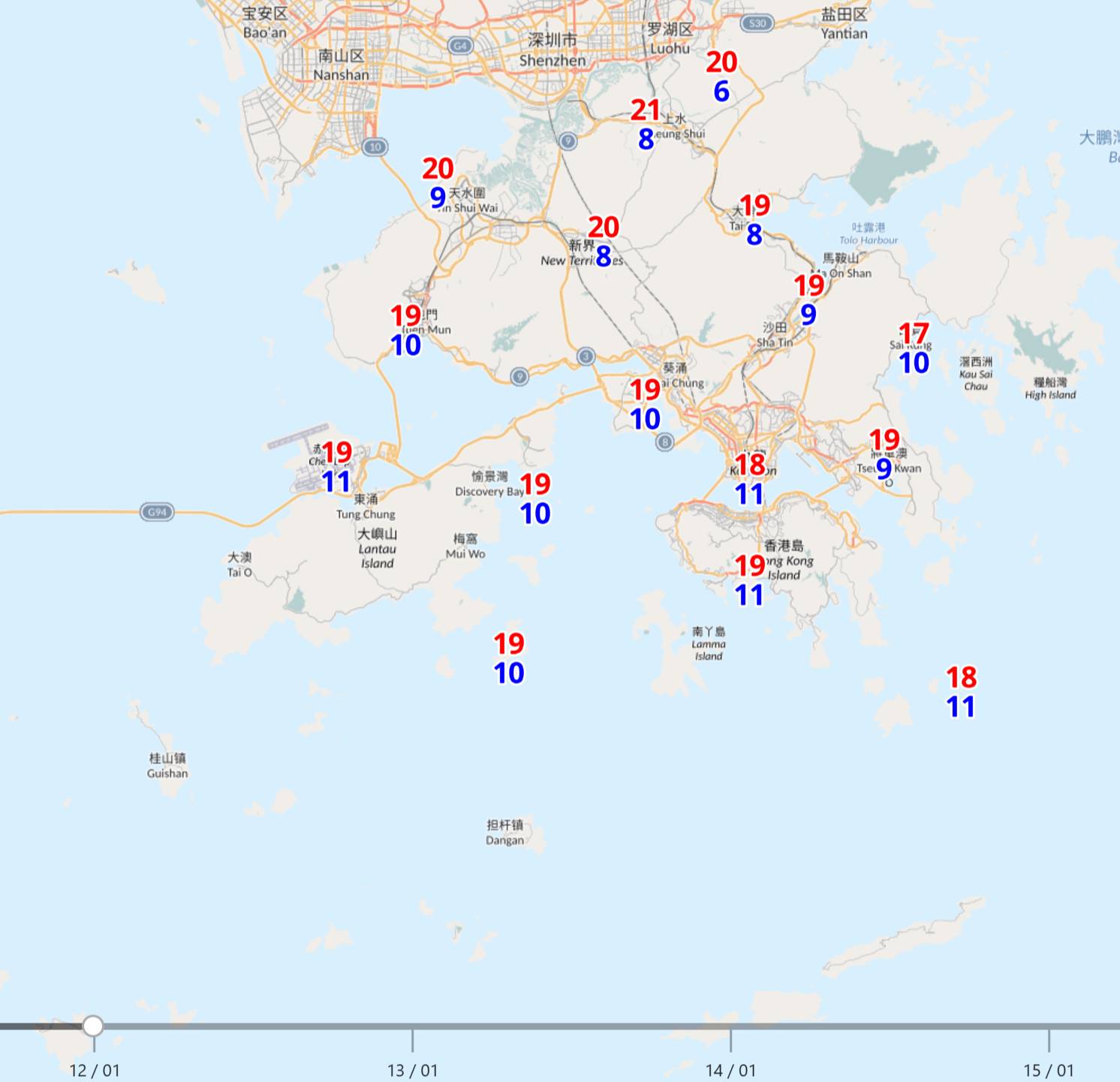 天文台今天 (1月10日) 表示,寒冷天氣警告生效,受強烈冬季季候風影響,今天早上市區錄得最低12.7度,部分地區更跌至10度以下。其中大帽山最低只有3度;而在大老山則只有6.3度,昂坪6.4度。
