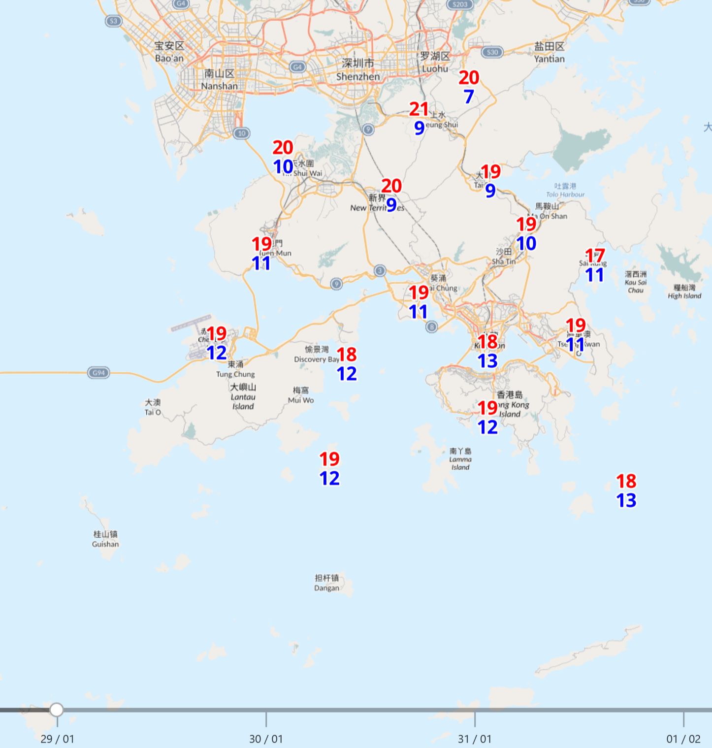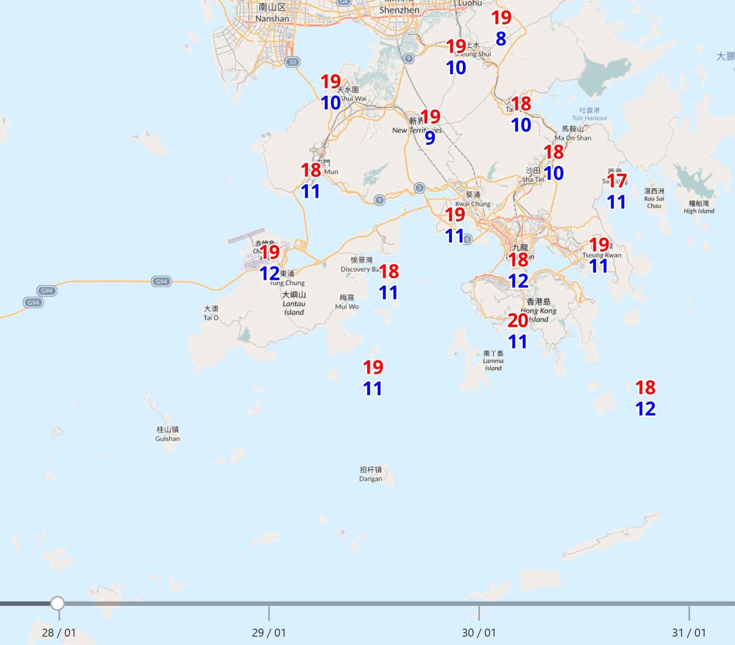 根據最新香港分區氣温預測顯示,明天 (1月28日年廿九) 及後天 (1月29日年初一) 多區氣温仍然處於10度或以下水平,其中打鼓嶺分別低見7度及8度。