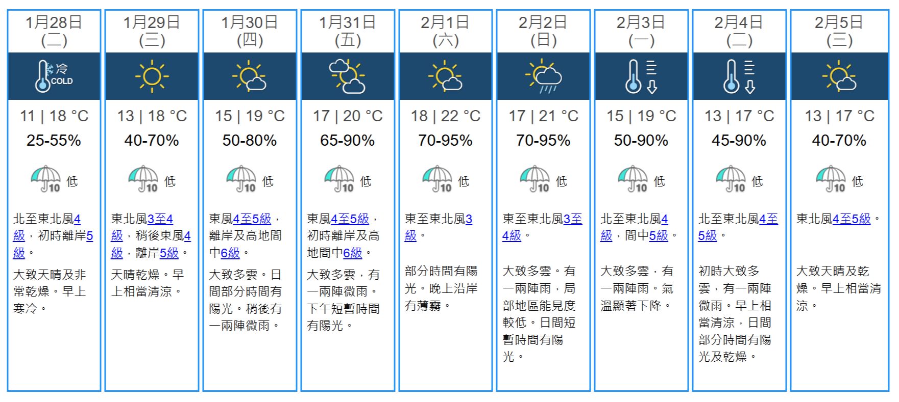 寒冷天氣警告現正生效,天文台今天 (1月27日) 表示,明早寒冷,新界部分地區及高地嚴寒,大致天晴及非常乾燥。年初一早上新界仍然寒冷,年初二及年初三風勢頗大,雲量逐漸增多及有一兩陣微雨。