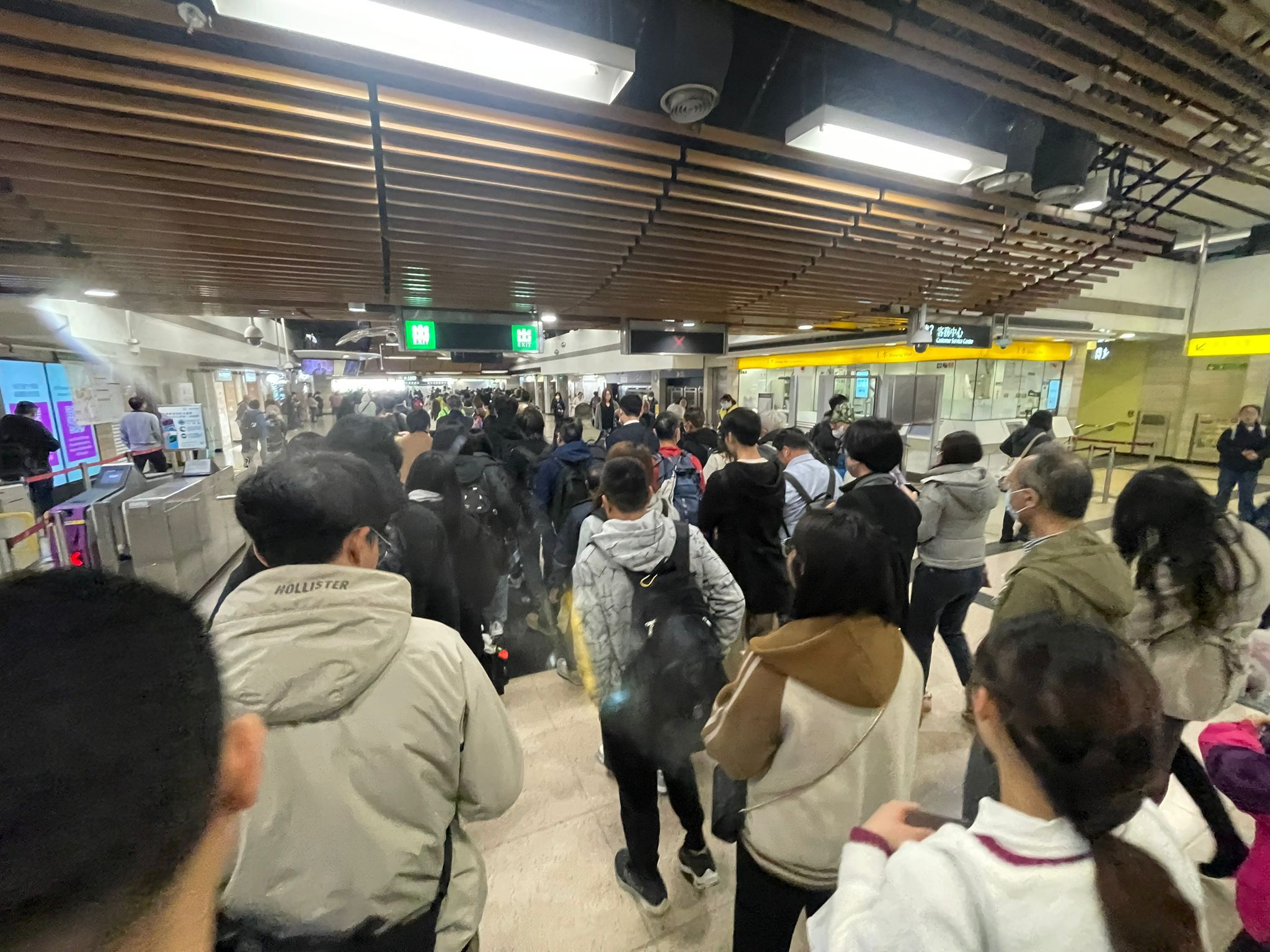 在太和站,南行往金鐘站的月台暫停開放,全部乘客都要迫在北行的一邊月台上落車,港鐵加派職員指示乘客。