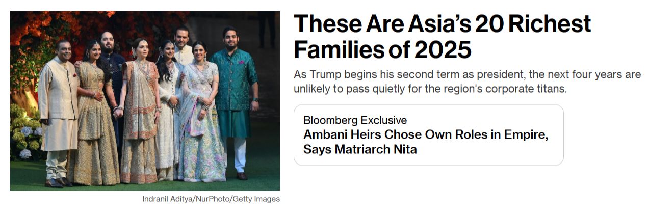 彭博今天 (2月13日) 發布2025年亞洲20大最富裕家族排行榜,但由於排名的標準是剔除了創業第一代家族,因此香港首富李嘉誠家族和恒基地產李兆基家族均未有上榜,而中國互聯網巨頭馬化騰及馬雲的家族也榜上無名。
