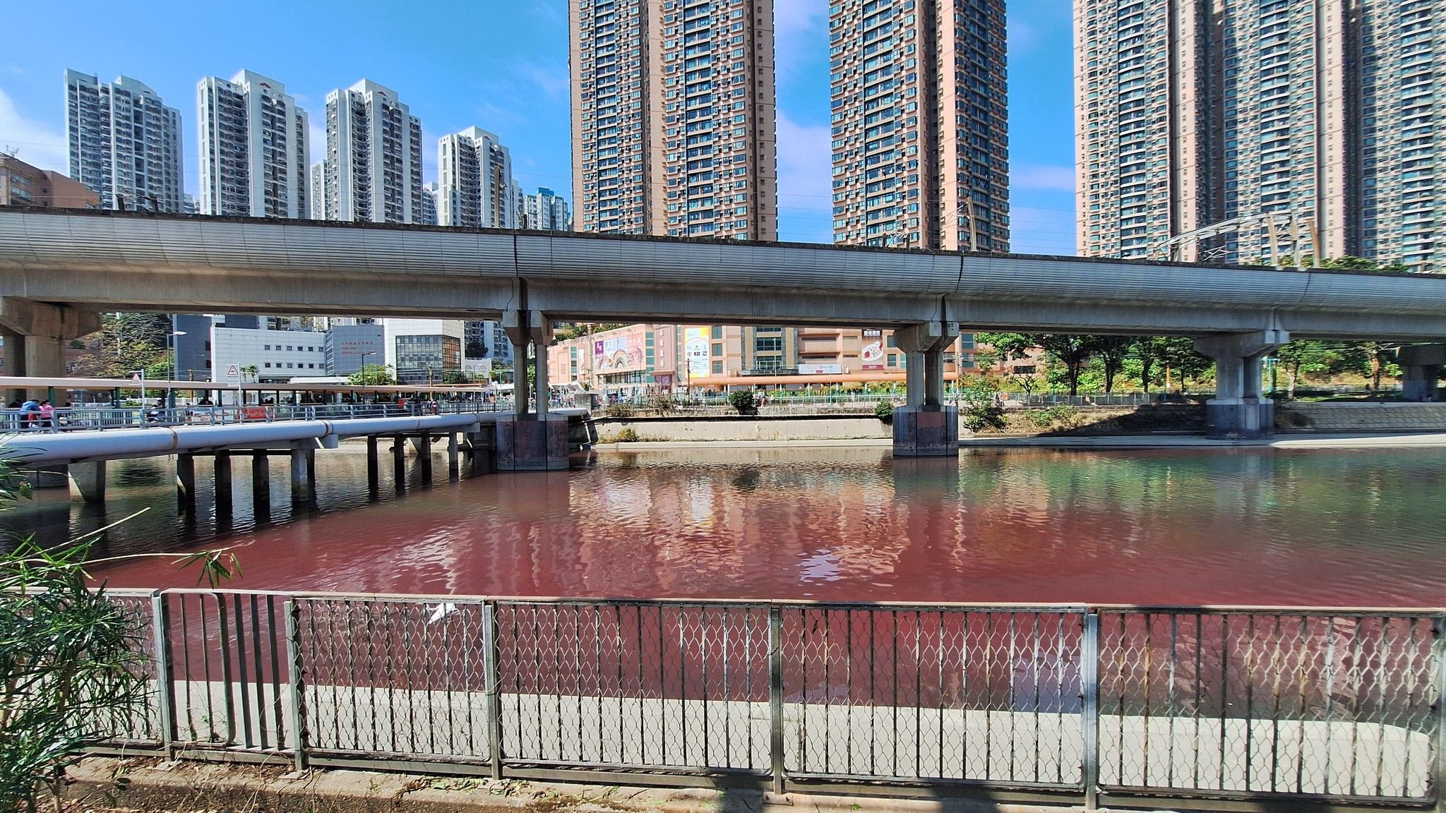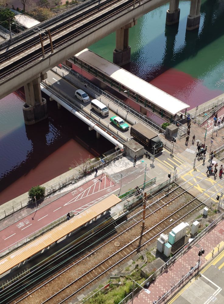 圖片中可見屯門河近卓爾居的一段河道,懷疑被從排水渠流出的工業污水染污,造成大面積血紅色,把河水分成紅綠兩色形成強烈對比。