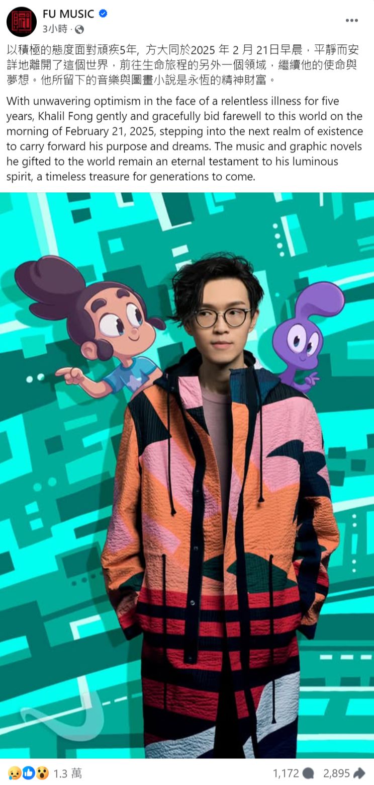 賦音樂FU MUSIC表示:「以積極的態度面對頑疾5年, @方大同 於2025 年 2 月 21日早晨,平靜而安詳地離開了這個世界,前往生命旅程的另外一個領域,繼續他的使命與夢想。他所留下的音樂與圖畫小說是永恒的精神財富。」