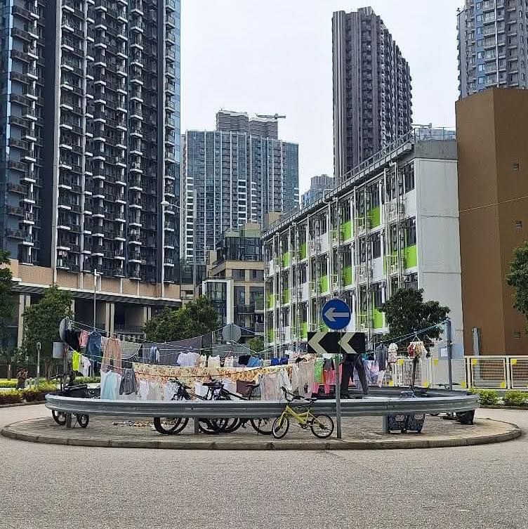 該圖片中可見,啟德私宅外的迴旋處上有不少衣服正在晾曬,有如舊公屋常見的場景,但迴旋處的周圍除了是私樓「天寰」,亦有過渡性房屋項目「啟福居」及德朗邨等,形成極大反差。
