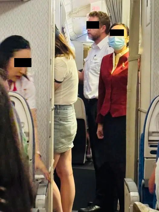 該圖片可見,當時機上一男一女的機組人員,相信正在處理有關事宜,但圖片未有拍攝到涉事乘客的容貎。