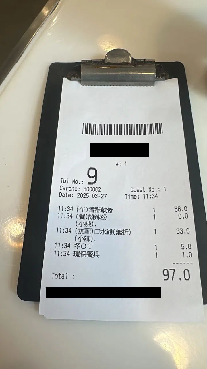 根據該圖片顯示,該食客最終仍要自付1元的一次性食具費。