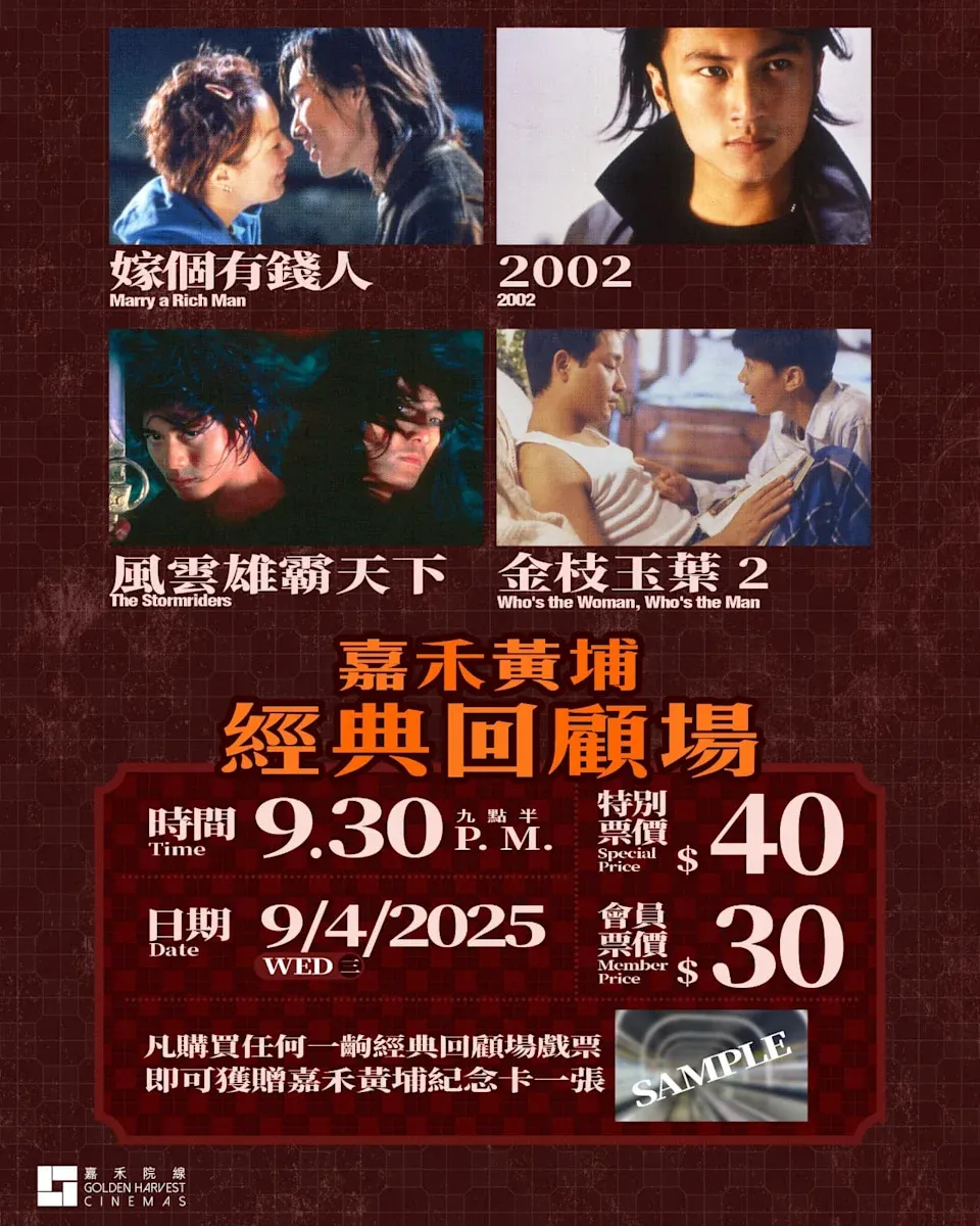 此外,為感謝戲迷多年支持,特別準備多重驚喜回饋市民,包括 4 月 9 日當晚尾場時段將會分別呈獻四部經典電影,包括《嫁個有錢人》、《2002》、《風雲雄霸天下》、《金枝玉葉 2》,票價為 40 元,會員票價為 30 元。