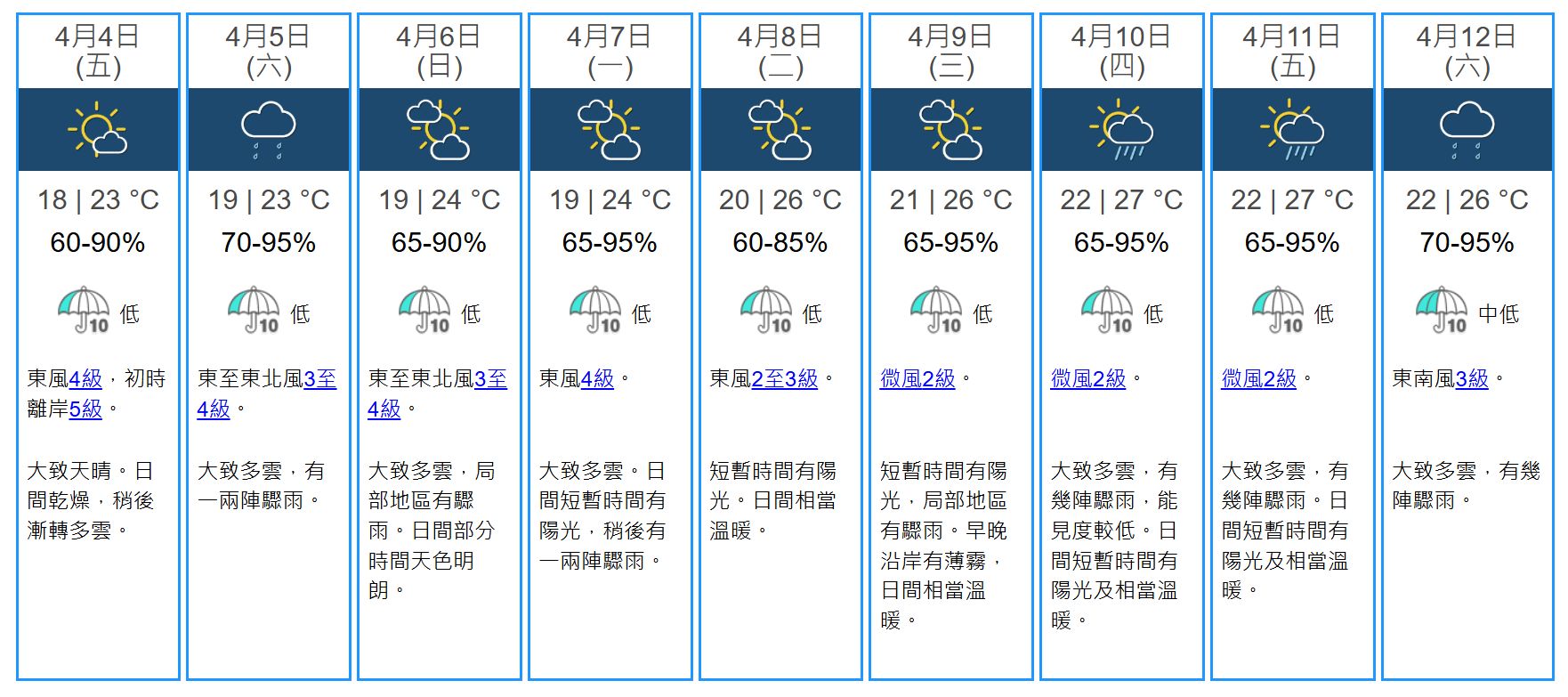 天文台預計,本星期六 (4月5日) 大致多雲,有一兩陣驟雨,隨後一兩日短暫時間有陽光,下周中期日間相當溫暖。此外,一道雲帶會在接近週末至下周初覆蓋華南地區,該區有幾陣驟雨,預料下周中期廣東風勢微弱,日間相當溫暖,早晚沿岸有薄霧;受高空擾動影響,下周後期華南地區有幾陣驟雨。
