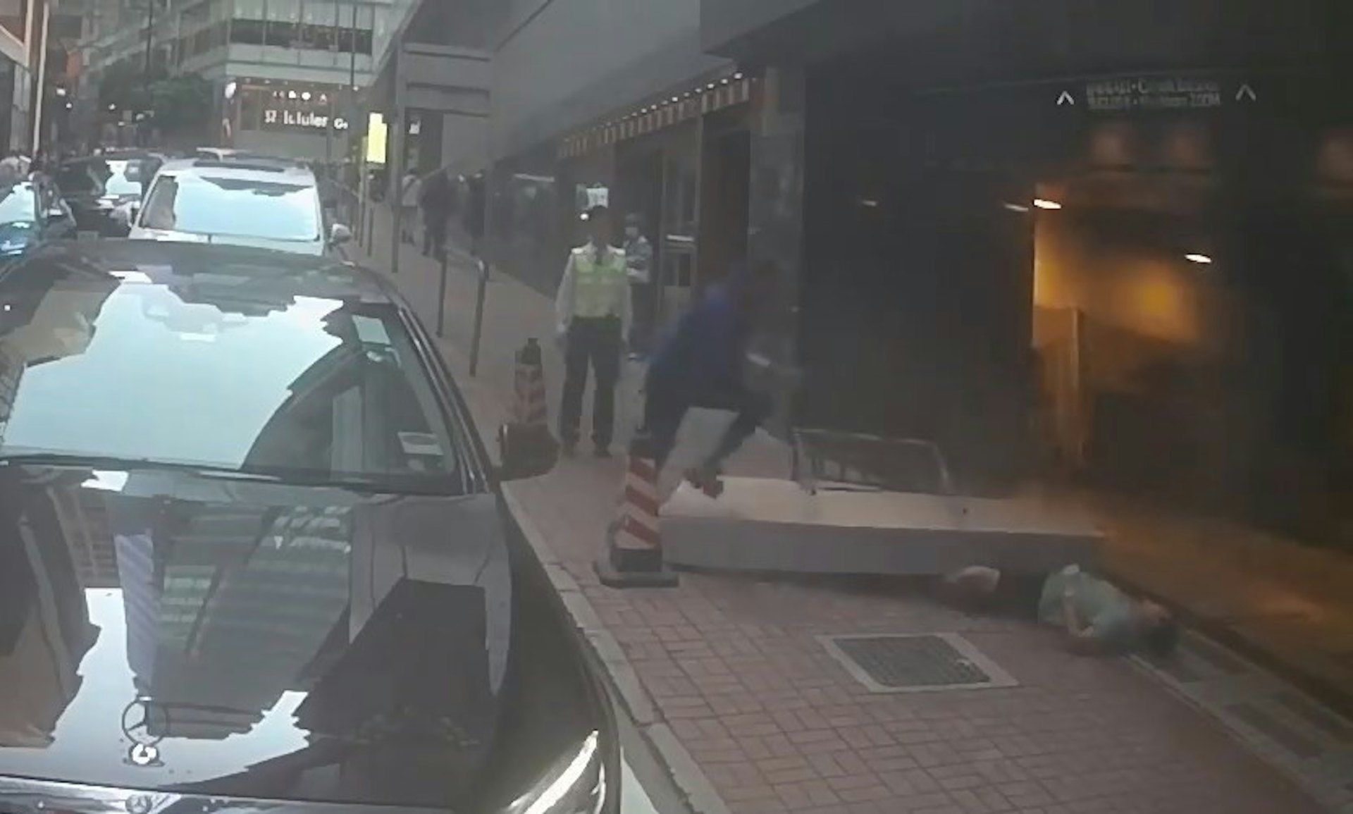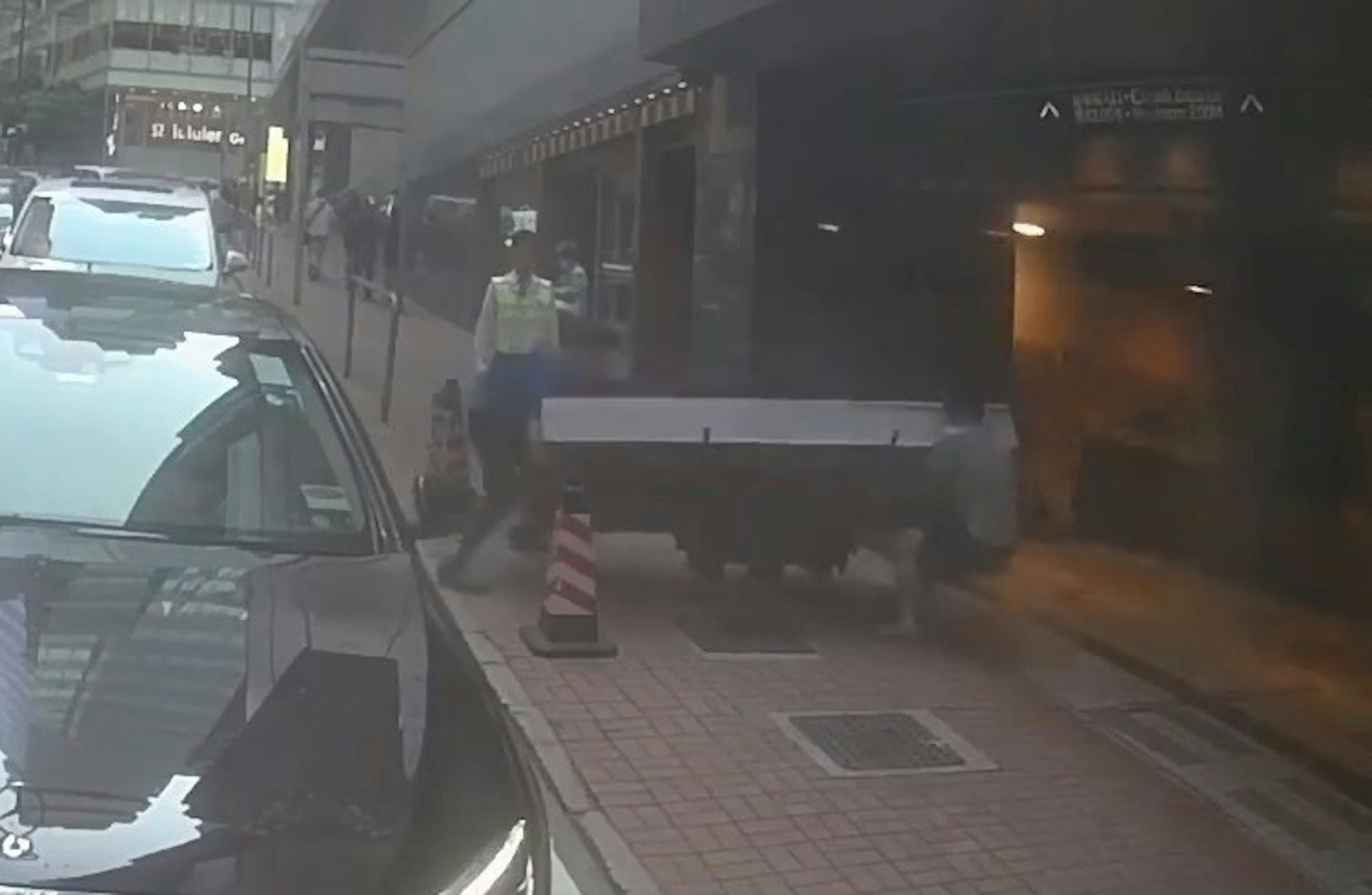 網上FB群組最新流傳一段車CAM視頻,可見,兩名男工人合力用手推車運送一塊巨型石膏板,但抵達停車場對開時,石膏板突然倒下,壓中站在旁邊的男工人, 男工人下半身被壓住,動彈不得,工友上前嘗試將石膏板托起但不成功,之後「就地取材」把一支插在手推車的鐵棍拿出,以「槓桿原理」把石膏板撬起,而其餘工友上前施救。