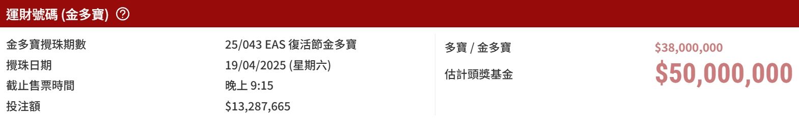 六合彩復活節金多寶2025將於本星期六(4月19日)晚上9時30分進行新一期攪珠,這次金多寶彩池注入3800萬元,若以10元一注獨中,估計頭獎基金可獲5000萬元,是次六合彩攪珠會在星期六晚上9時15分截止投注。