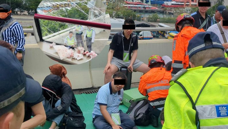 網上圖片所見,城巴車頭被劏開,碎片滿地,上層車廂車頭位置,遺下大量相信是乘客的染血紙巾。