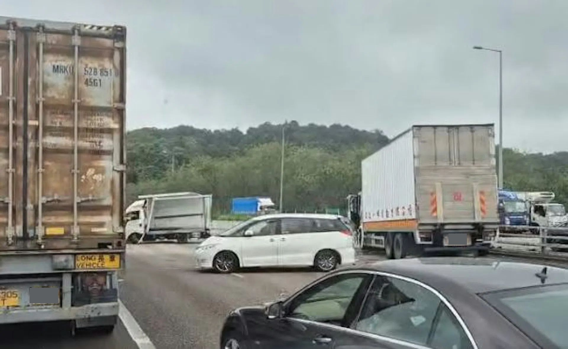 今日(5月8日)早上約11時半,吐露港公路往九龍方向近大埔滘發生5車連環相撞意外,當中包括3輛私家車、1輛輕型貨車及1輛中型貨車,其中輕型貨車車斗被撞至變形,中貨車身被撞至凹陷車身被撞至散開,其中一輛私家車則橫亙路中。