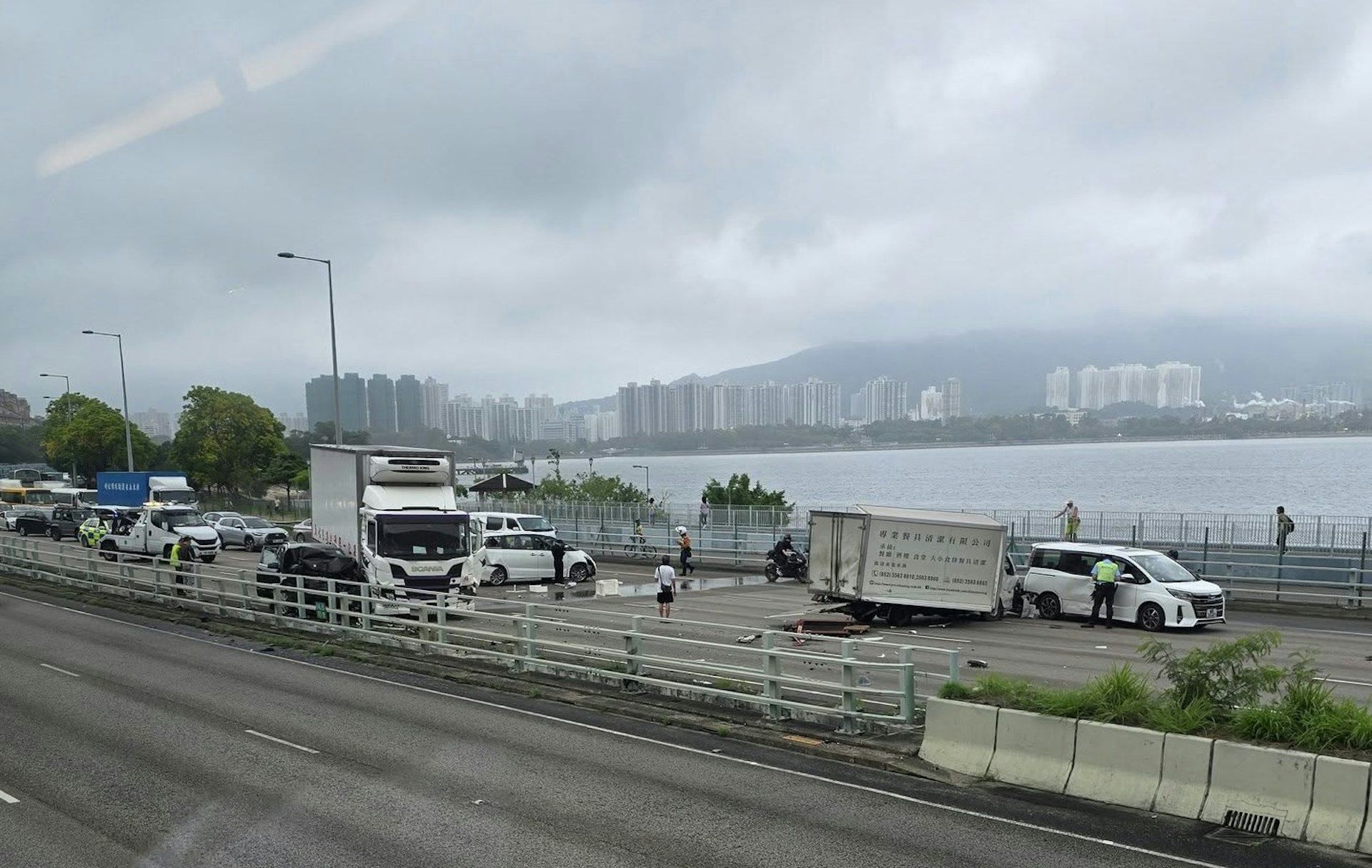 受到有關交通意外影響,吐露港公路(往九龍方向)近海景山莊一度全線封閉造成大塞車,直至今天下午1時許解封部分行車線。