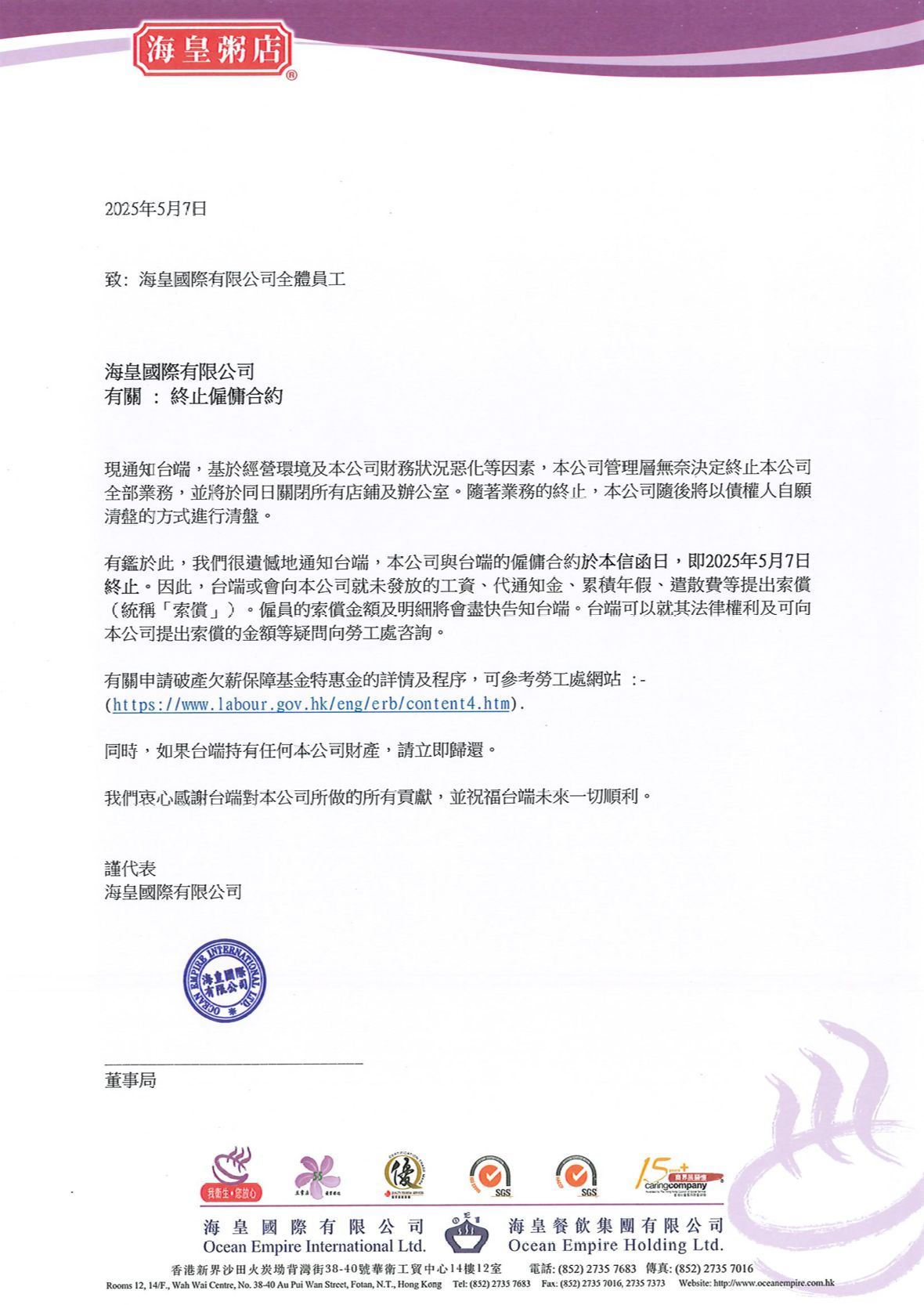 海皇國際有限公司星期三向員工發信,指因經營環境及財務狀況等因素,決定終止全部業務,公司將以債權人自願清盤方式清盤,稱員工可就未發放工資、代通知金、累積年假、遣散費等提出索償,並就相關法律權益向勞工處諮詢。