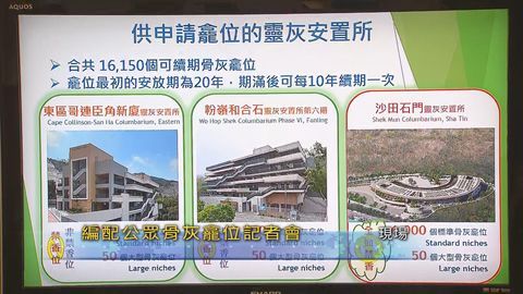 食環署今天 (5月14日) 表示,於和合石、哥連臣角、石門新建靈灰安置所,合共1.6萬個龕位,下周一 (5月19日) 起接受申請。