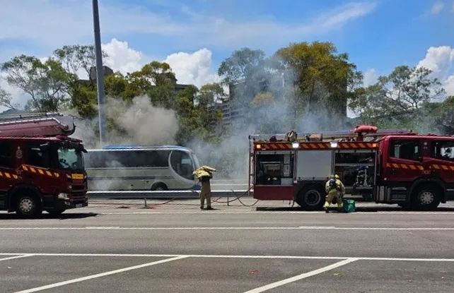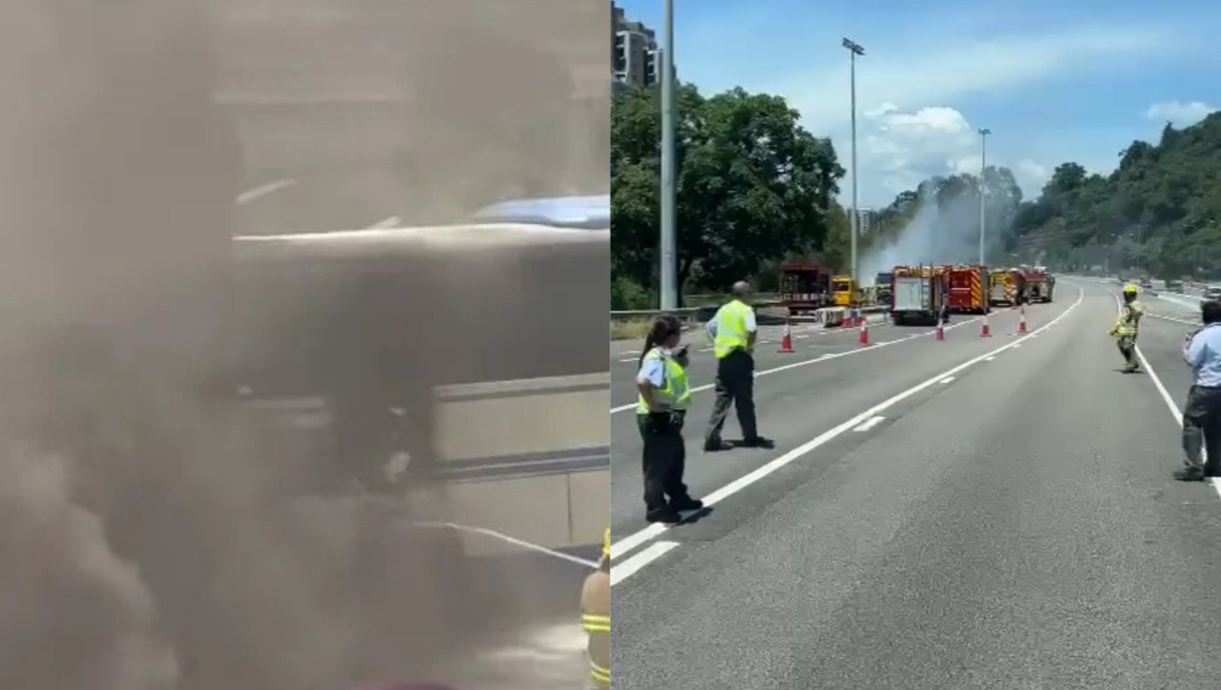 今日(5月22日)下午1時許,獅子山隧道公路往沙田方向出口近收費亭,一輛旅遊巴突然起火冒煙,消防員接報開喉灌救,暫時沒有受傷報告。