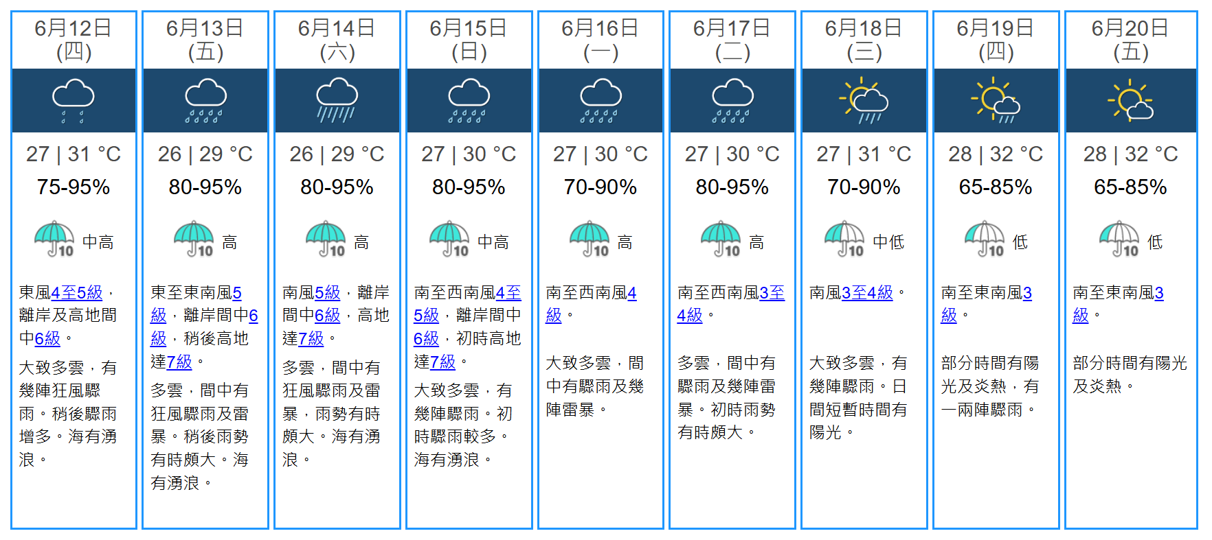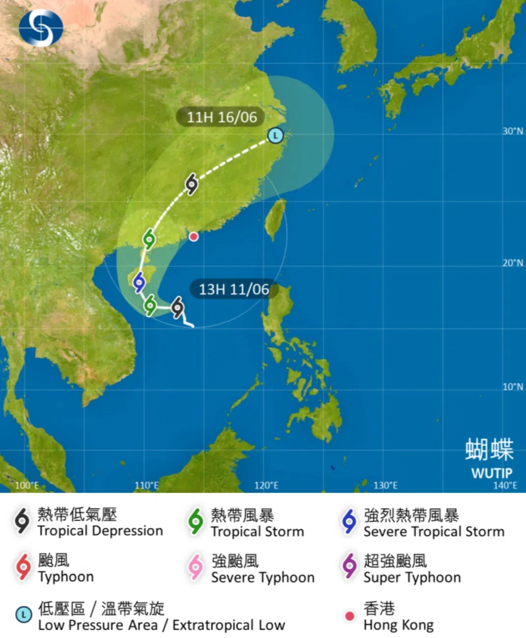 天文台預料,蝴蝶會在今天及明天 (6月12日) 逐漸增強並大致移向海南島,隨後移至雷州半島一帶,天文台會視乎其強度、與本港的距離及本地風力變化,評估是否需要在明日(6月12日)稍後至星期五(6月13日)改發三號強風信號。