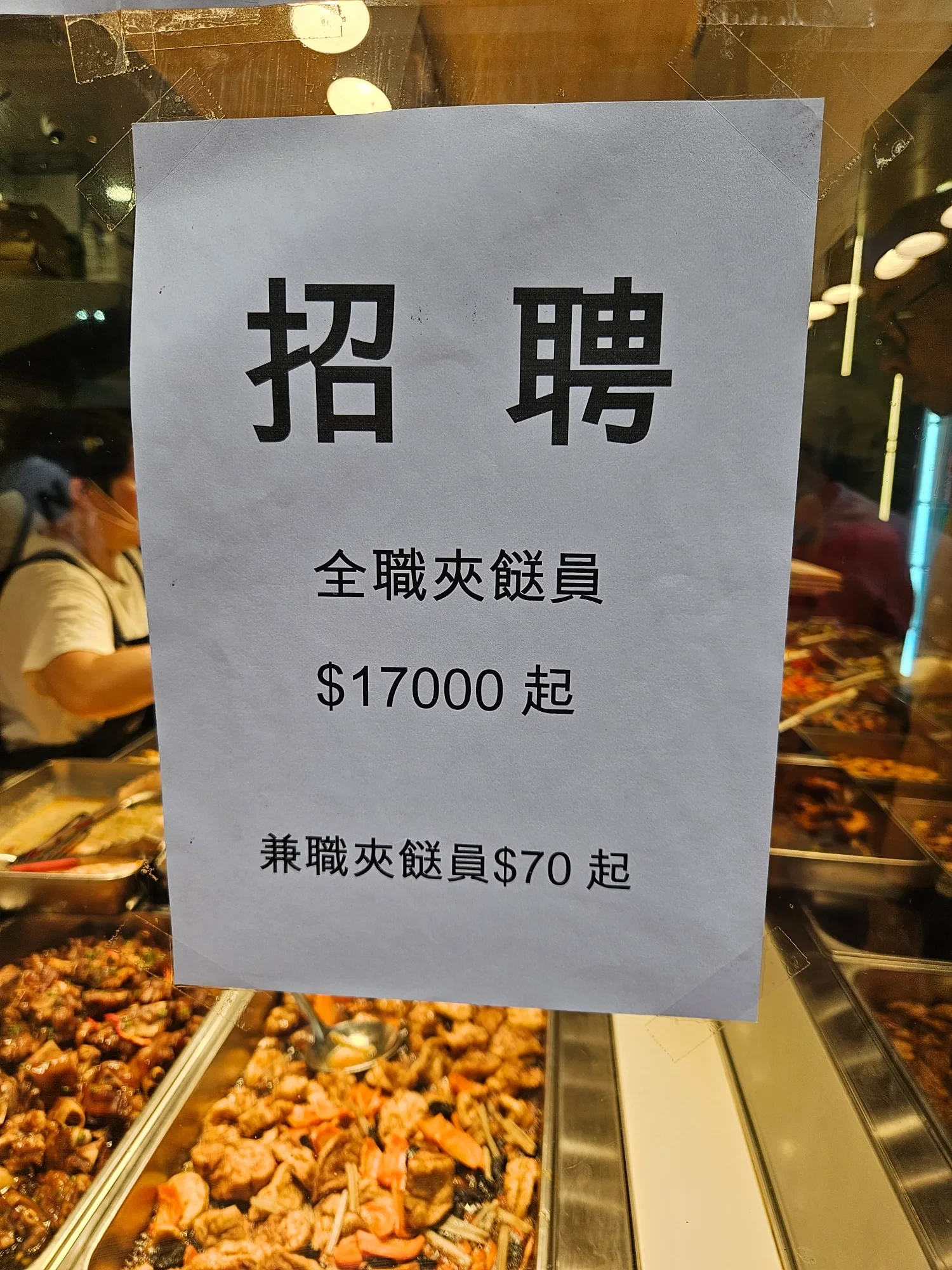 圖片中可見一間「兩餸飯」店的廚窗張貼了一張搶眼的招聘廣告:「招職 全職夾餸員 $17,000起 兼職夾員$70起」。