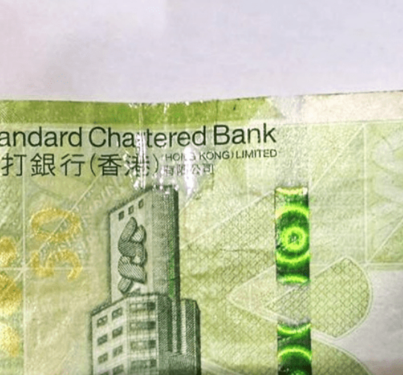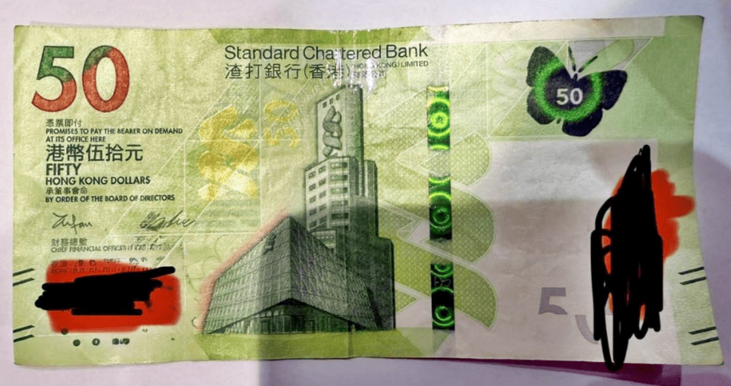 圖片中該張由渣打銀行發行的50元鈔票,其中間上方的部分區域,明顯貼上了膠紙。