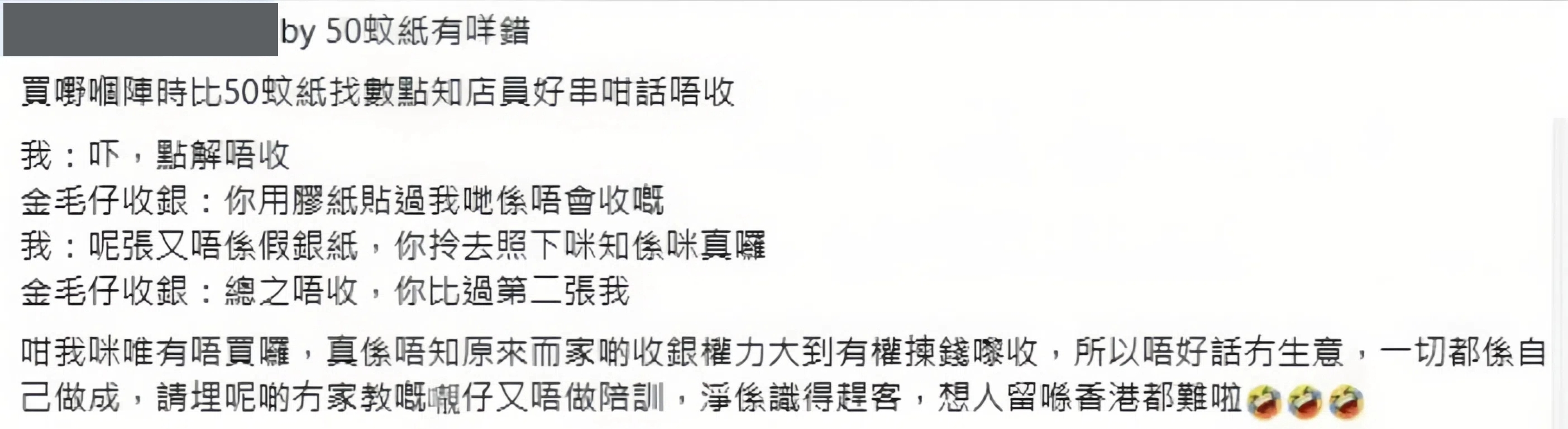 網上FB群組近日流傳一則帖子並且附上圖片,帖子題為「50蚊紙有咩錯」,指出「買嘢嗰陣時俾50蚊紙找數點知店員好串咁話唔收。 我:吓,點解唔收? 金毛仔收銀:你用膠紙貼過我哋係唔會收嘅。 我:呢張又唔係假銀紙,你拎去照下咪知係咪真囉。 金毛仔收銀:總之唔收,你俾過第二張我。 咁我咪唯有唔買囉,真係唔知原來而家啲收銀權力大到有權揀錢嚟收,所以唔好話冇生意,一切都係自己做成,請埋呢啲冇家教嘅𡃁仔又唔做培訓,淨係識得趕客,想人留喺香港都難啦」。