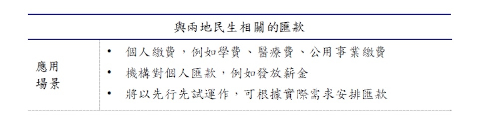 推出初期涵蓋個人對個人和與兩地民生相關的匯款,包括個人繳費﹙例如學費、醫療費、公用事業繳費﹚及機構對個人匯款﹙例如發放薪金﹚。
