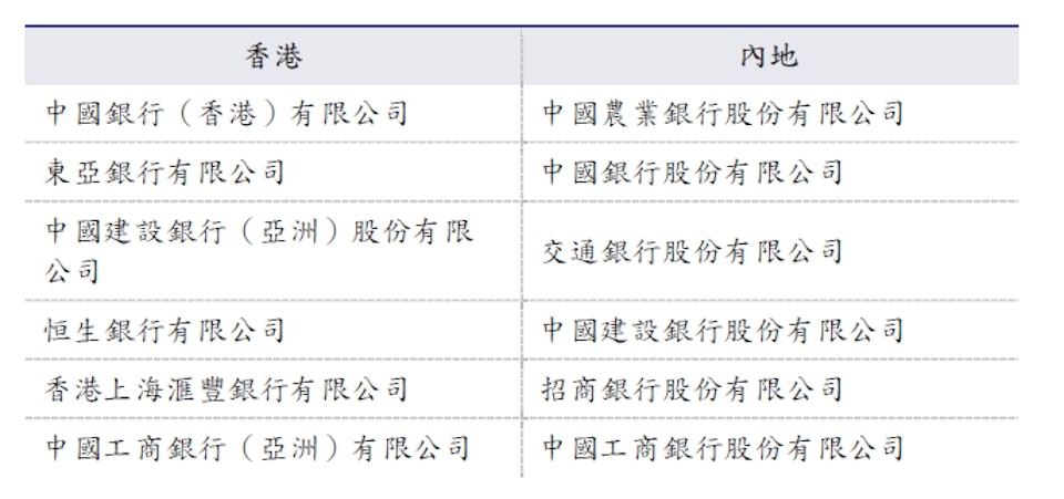 「跨境支付通」推出初期,中港兩地共有12間機構參與,其中香港參與機構有6間,分別為中銀香港、東亞、建行(亞洲)、恒生、滙豐、工銀(亞洲)。