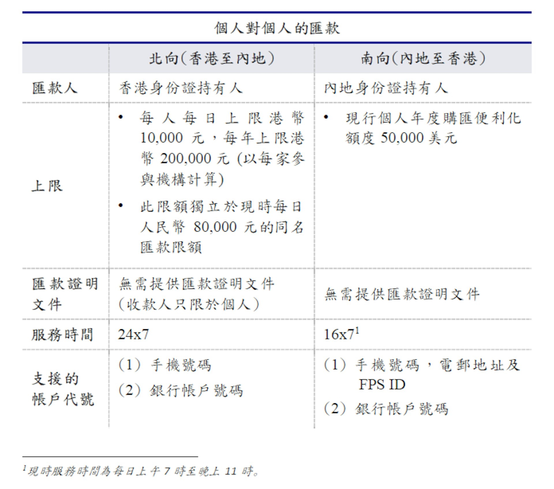 港人每日北向匯款1萬元,每年上限20萬元,並獨立於目前每日8萬元人民幣同名匯款限額;內地居民將資金南下匯款則並無限額,但受限制於目前個人年度購匯額度5萬美元。