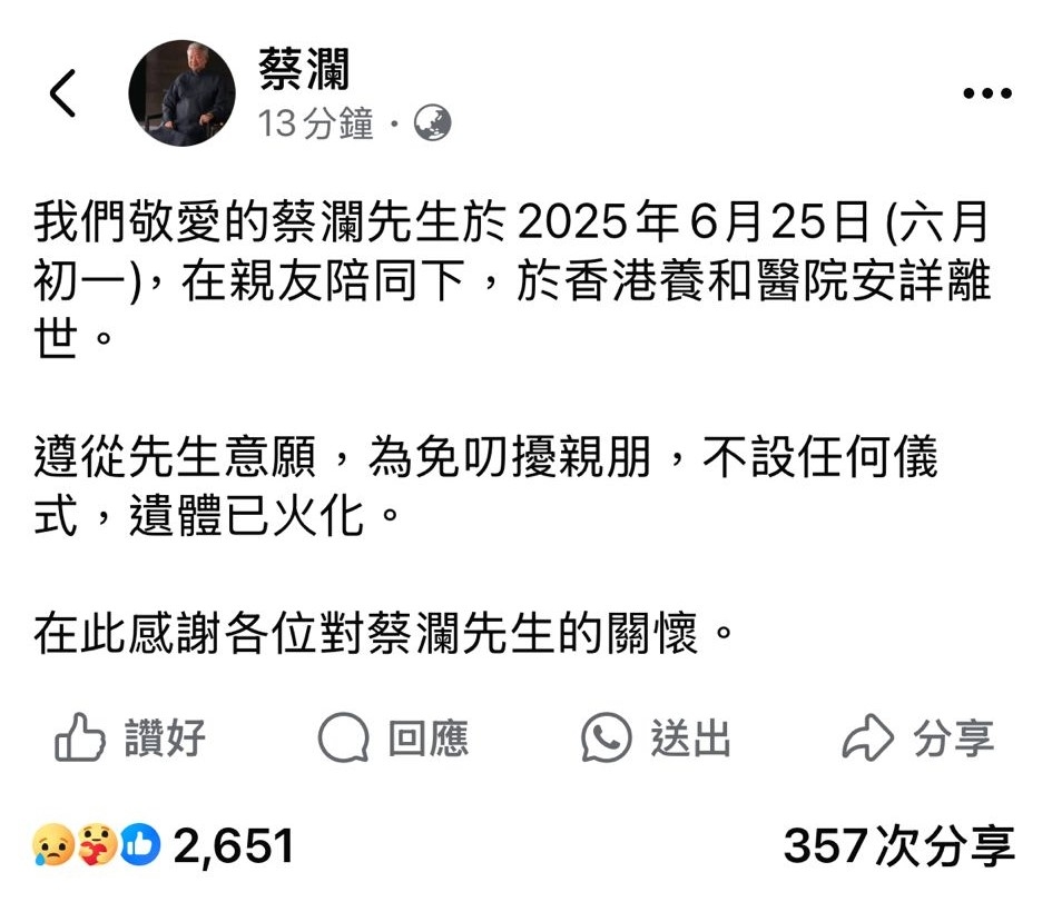 根據代表蔡瀾的有關方面今天 (6月27日) 下午3時許透過社交媒體發帖指出:「我們敬愛的蔡瀾先生於2025年6月25日 (六月初一),在親友陪同下,於香港養和醫院安詳離世。遵從先生意願,為免叨擾親朋,不設任何儀式,遺體已火化。在此感謝各位對蔡瀾先生的關懷。」