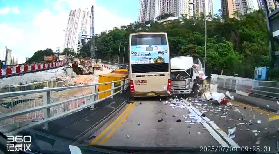 九巴表示,一輛214路線巴士駛至連德道時,對面線一輛貨車疑失控越線撞向巴士車頭,初步車長及多名巴士乘客受傷。