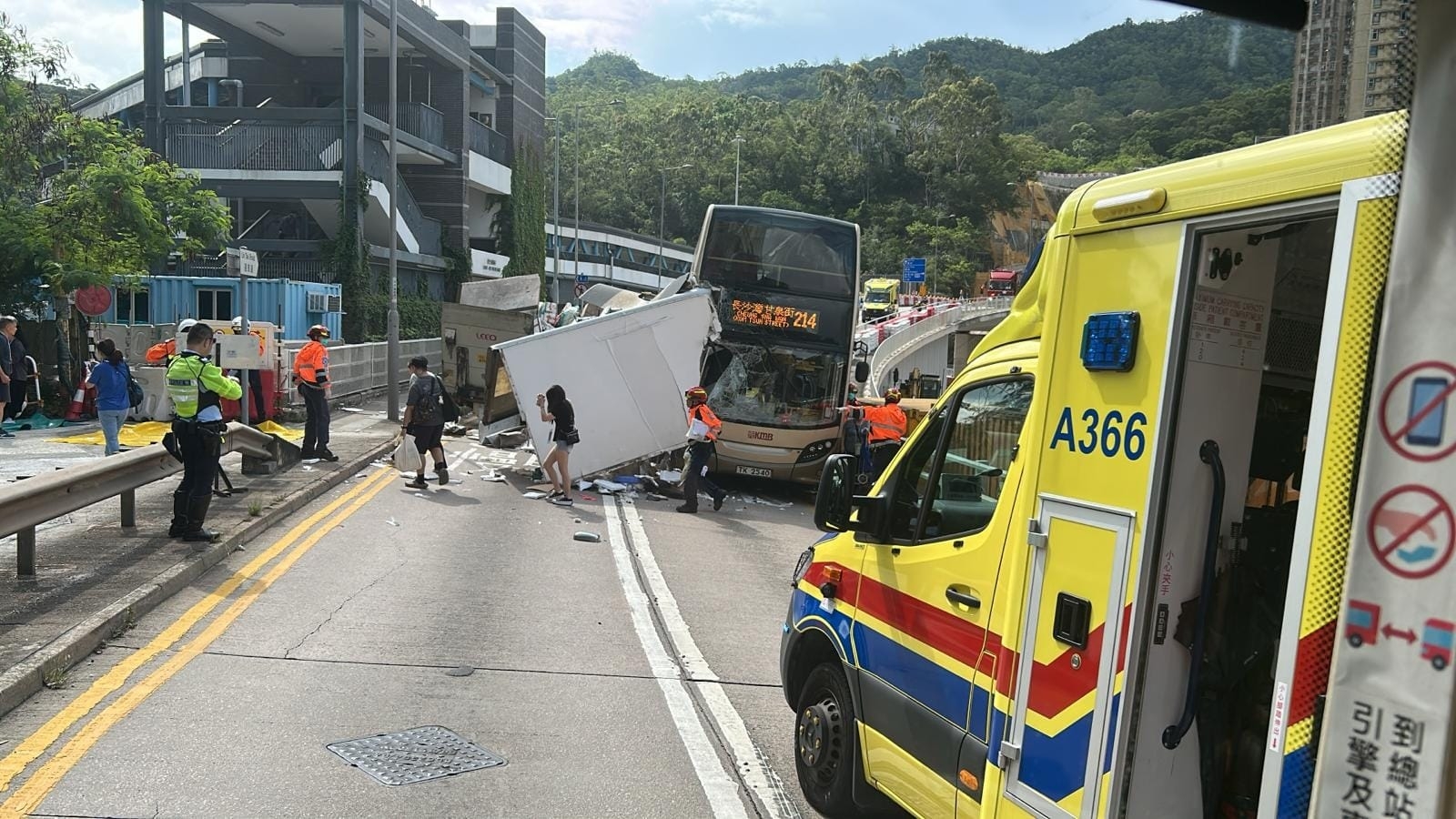 涉事的214線九巴的擋風玻璃碎裂,貨車則損毀嚴重,整個車斗盡毁,大量貨品及雜物散落一地。