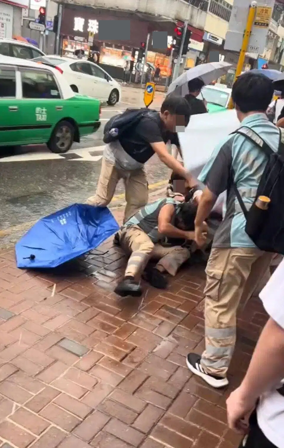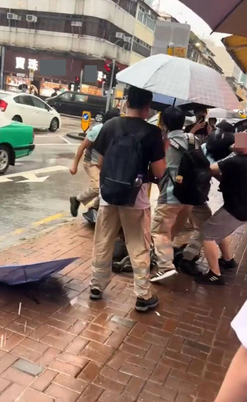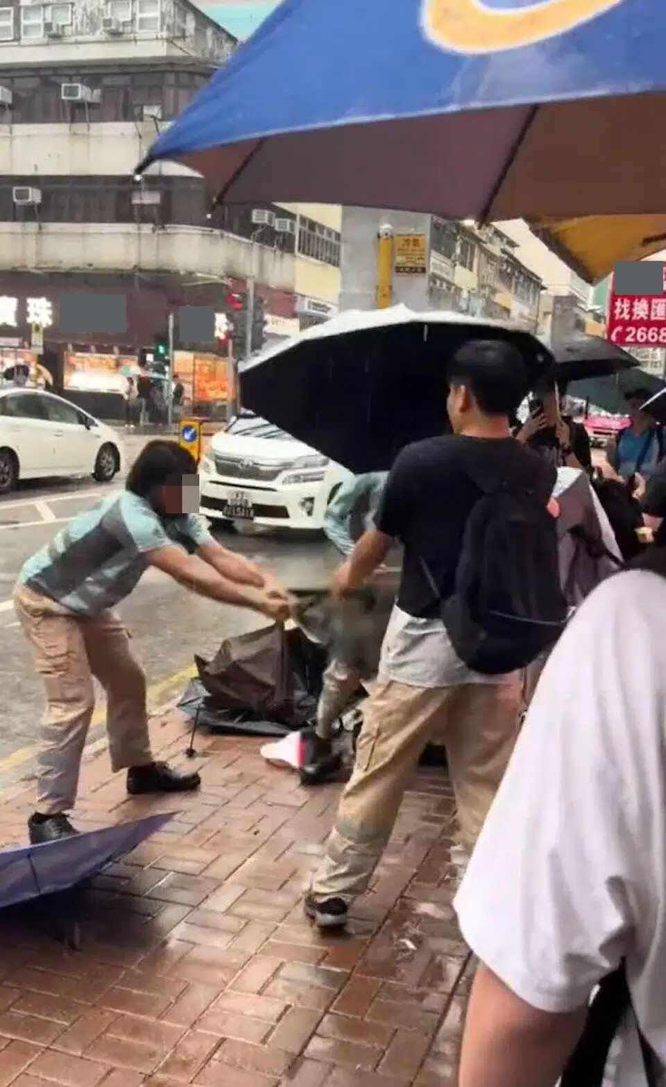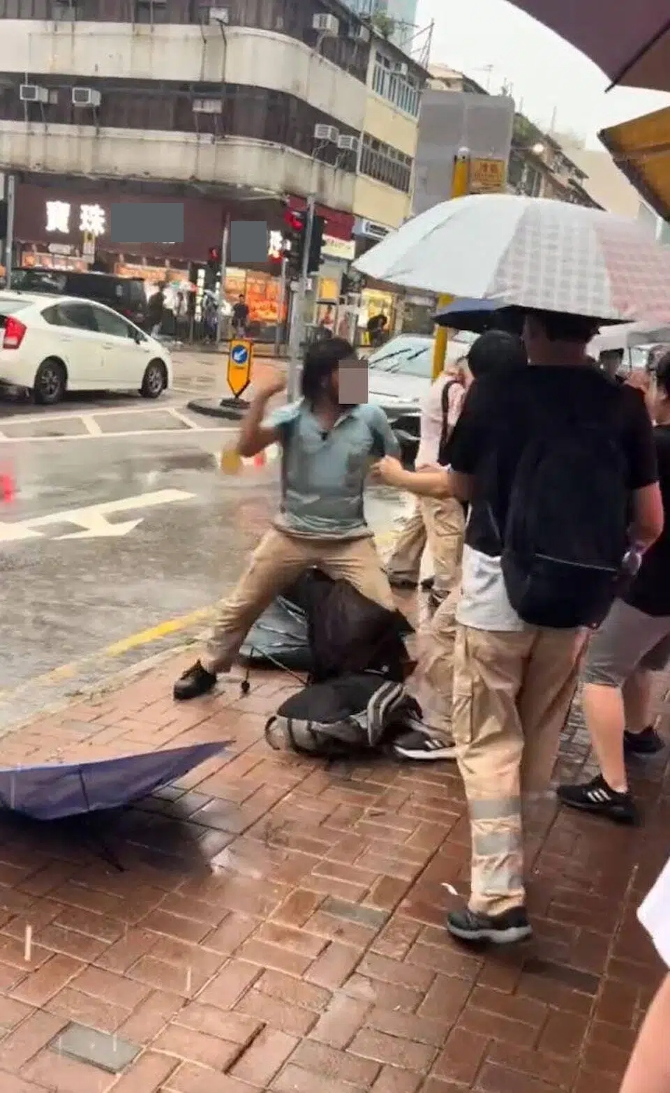 該視頻中可見,當時正值下雨眾人冒雨混戰,其中一名身穿制服的南亞裔男子倒地和另一名白衣男子扭打,傘子打開跌在地上,南亞裔男子起身還擊繼而打向1名同樣身制服的本地男子,之後彎腰取起背囊,本地男立即還手;另一名南亞裔男子見狀襲擊本地男。當南亞男取起背囊後,使出「背囊流星槌」突襲,附近1名身穿黑白色上衣的男子撐傘抵擋,打到傘子飛脫。南亞男孭好背囊後,見到一名黑衣男子正在舉起手機拍攝,於是上纏鬥,其他人見狀加入,眾人邊打邊走,往符興街方向冒雨奔跑,離開拍攝範圍,期間不斷有人表示「唔好郁手」、「唔好還手」、「唔可以打架」、「報警」等。