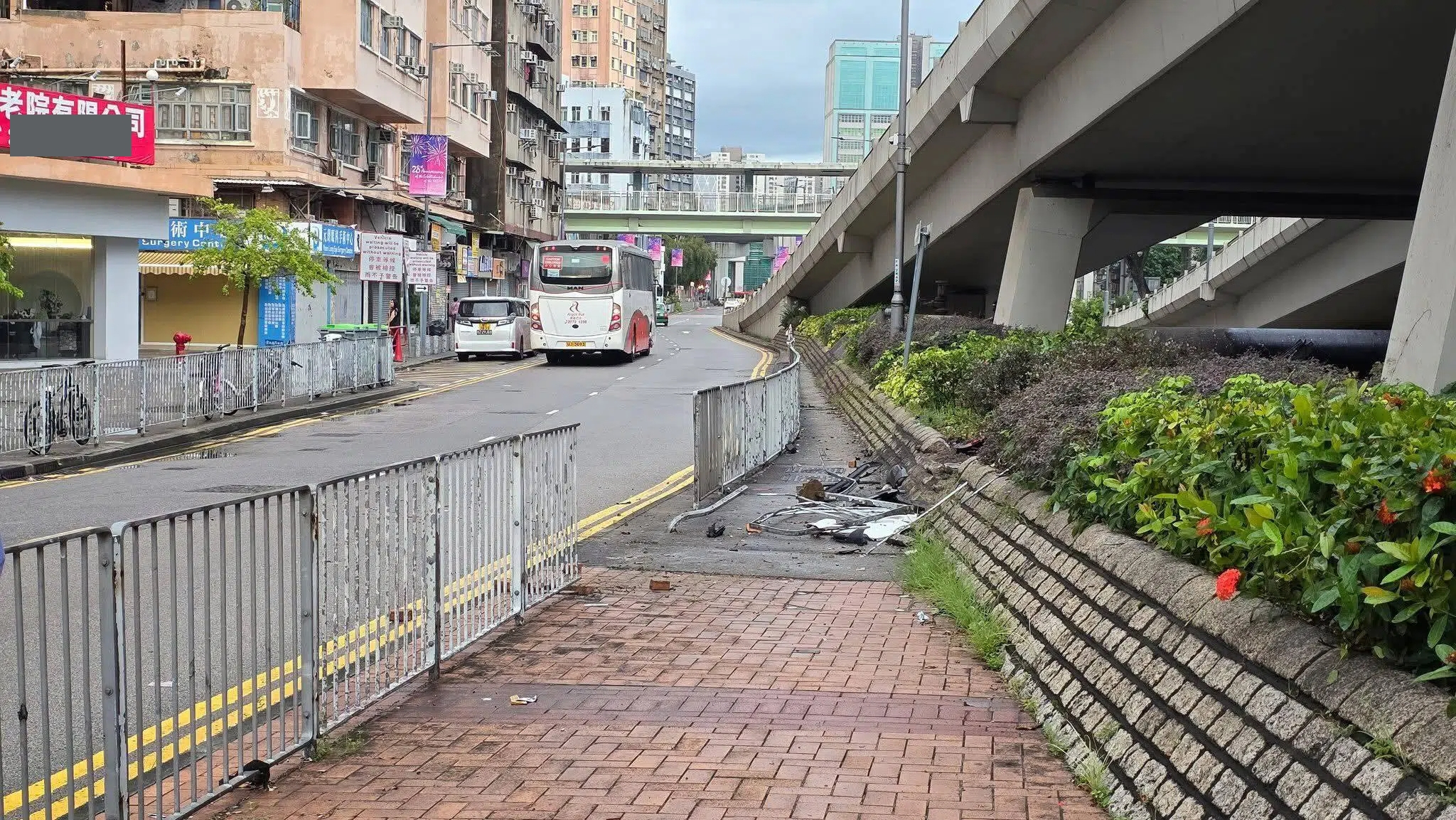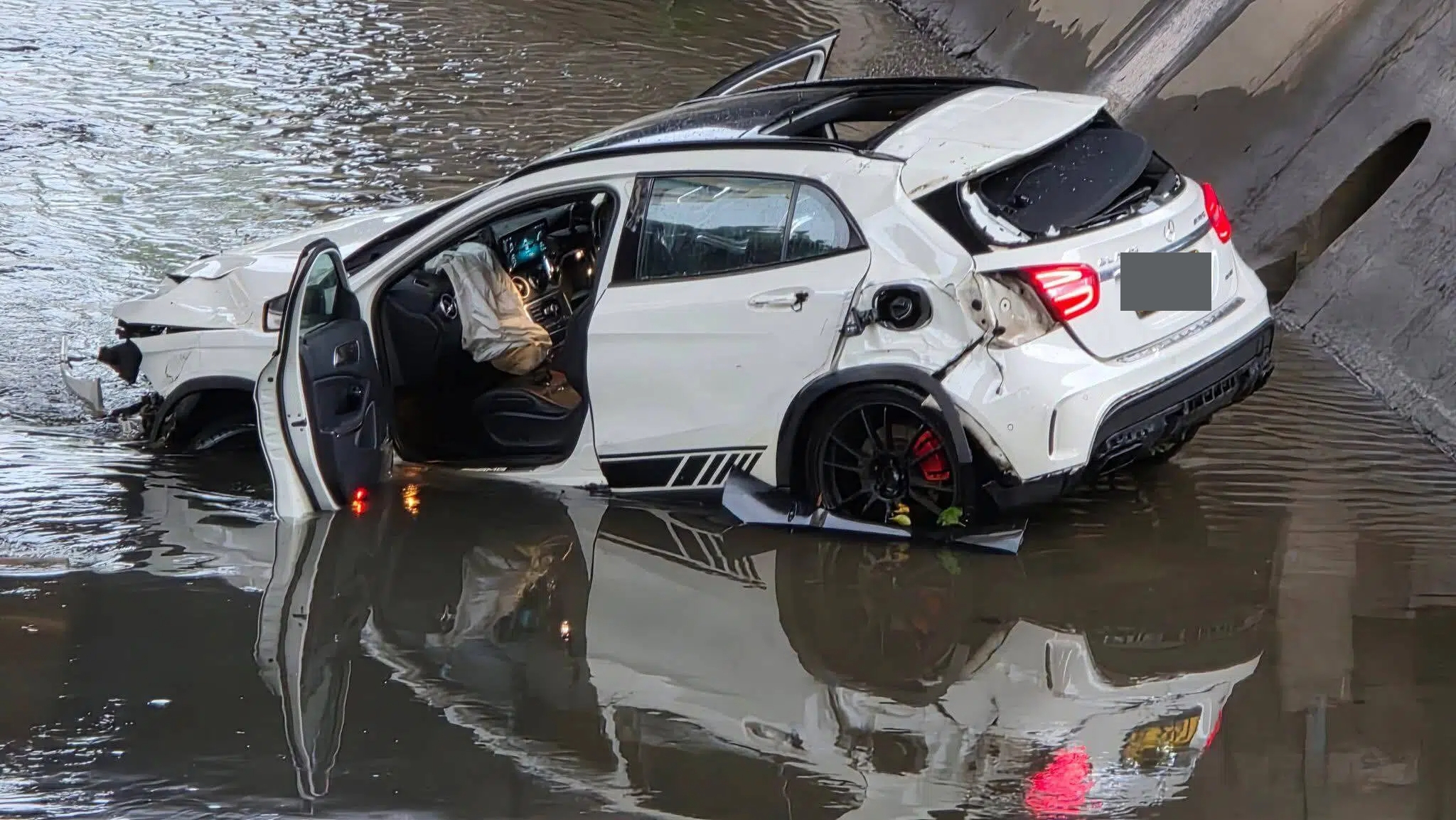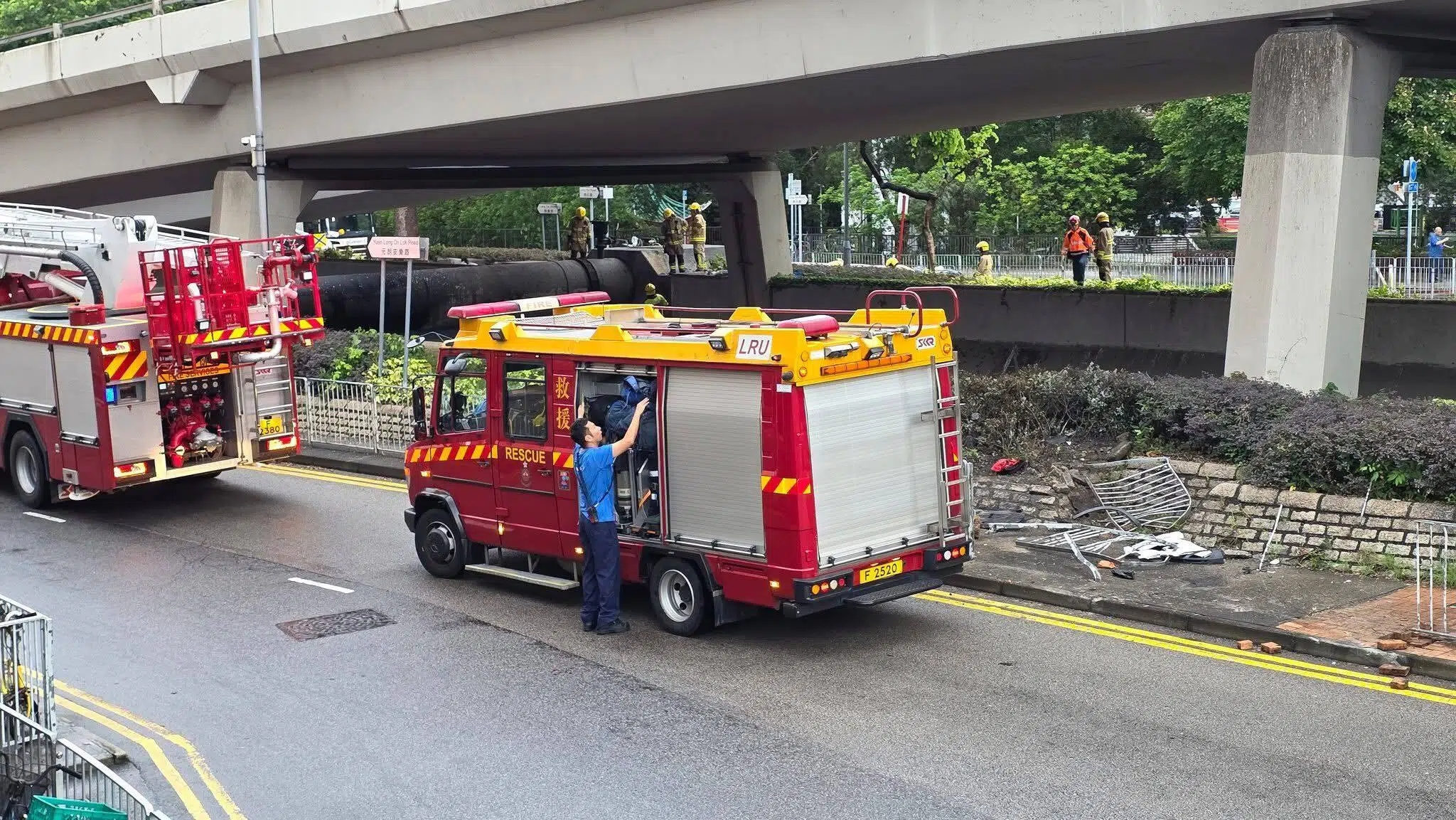 涉事平治疑撞毀元朗安樂路近水車館里路邊約兩米鐵欄後衝落明渠,汽車零件碎片散落一地,墮渠的平治車頭凹陷,尾燈損毀,車內安全氣袋彈出。