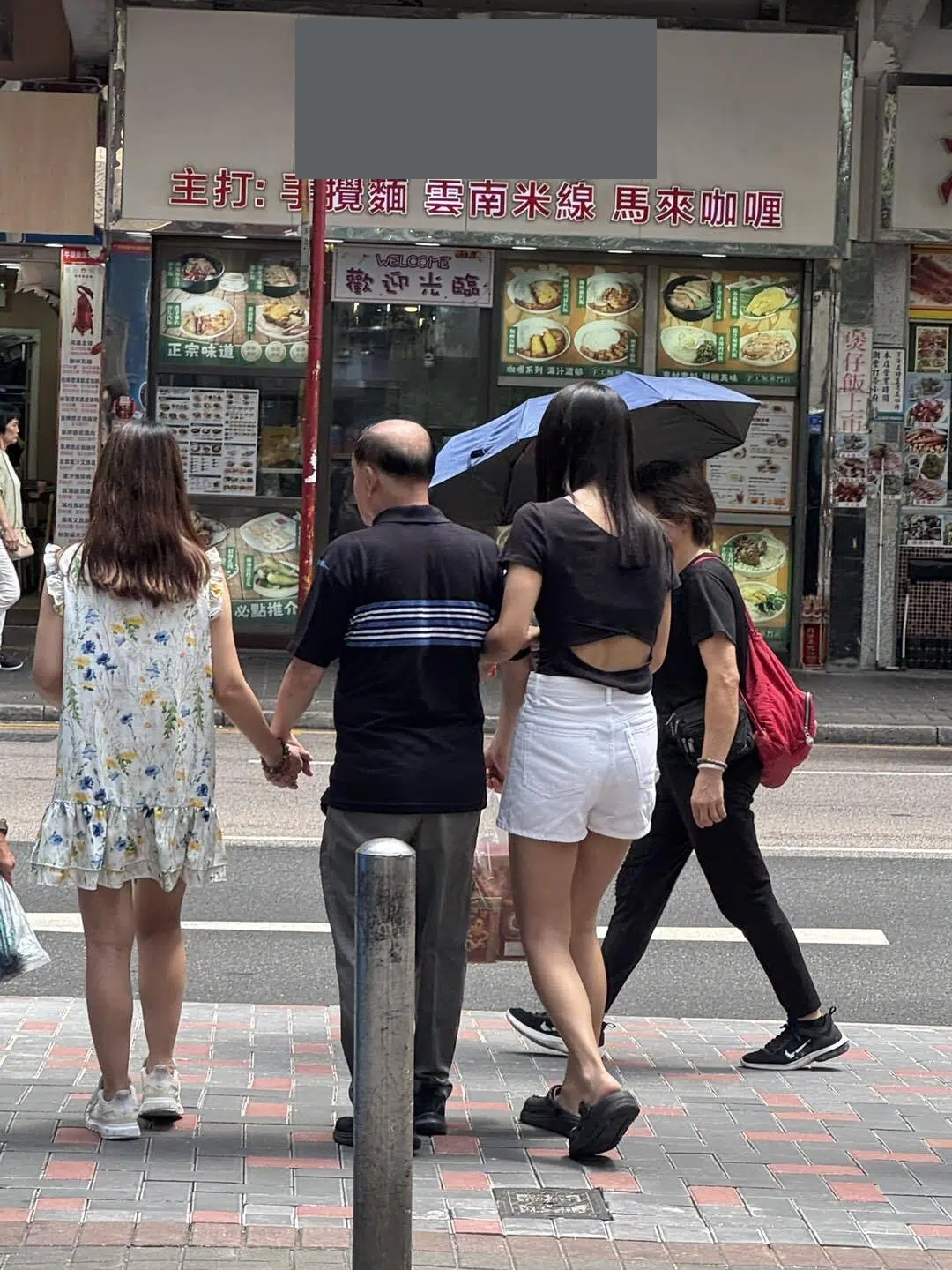 事發地點相信是官塘區,圖片中可見一名阿伯同時與2名年輕女子,分別在公園內及街上當眾手拖手, 惹來途人注目。