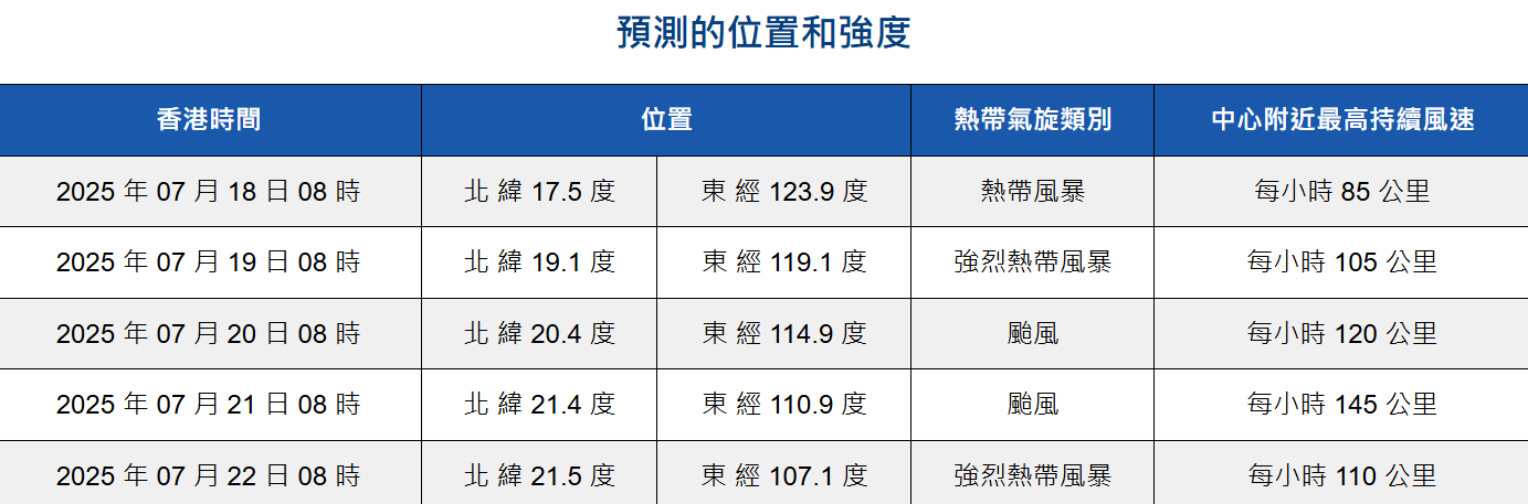 此外,天文台調高下周一(7月21日)的風力預測,預料初時吹東南風6級,離岸及高地達8級,稍後東南風5至6級,較原來預測的「離岸及高地達7級」為高,意味著下周一有機會繼續懸掛8號風球,但實際情況仍需視乎它最終的路徑和強度。