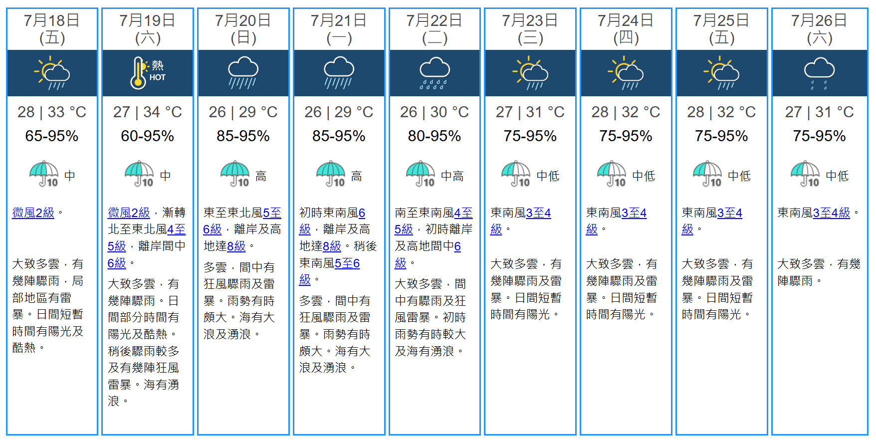 天文台表示,會考慮在本周六的日間發出三號強風信號,並視乎該熱帶氣旋與珠江口的距離、其強度及本地風力變化,評估是否需要在本周日 (7月20日) 發出8號風球。