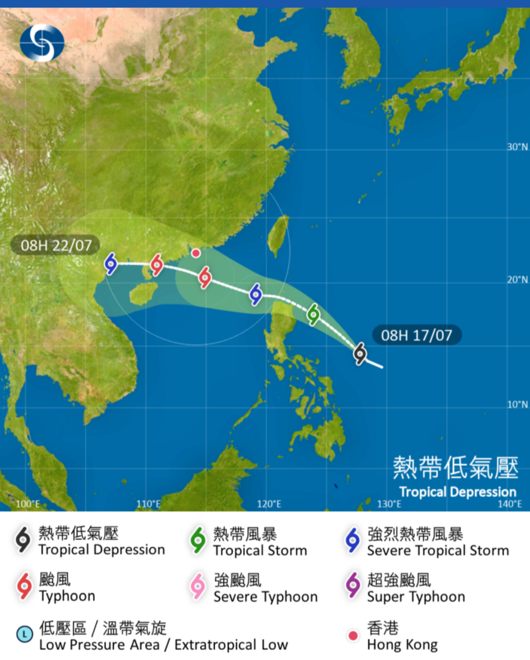 香港天文台在今天 (7月17日) 下午3時45分指出,在今天正午12時,位於菲律賓以東的熱帶低氣壓集結在馬尼拉以東約700公里,預料向西北移動,時速約22公里,大致移向呂宋北部一帶並逐漸增強。