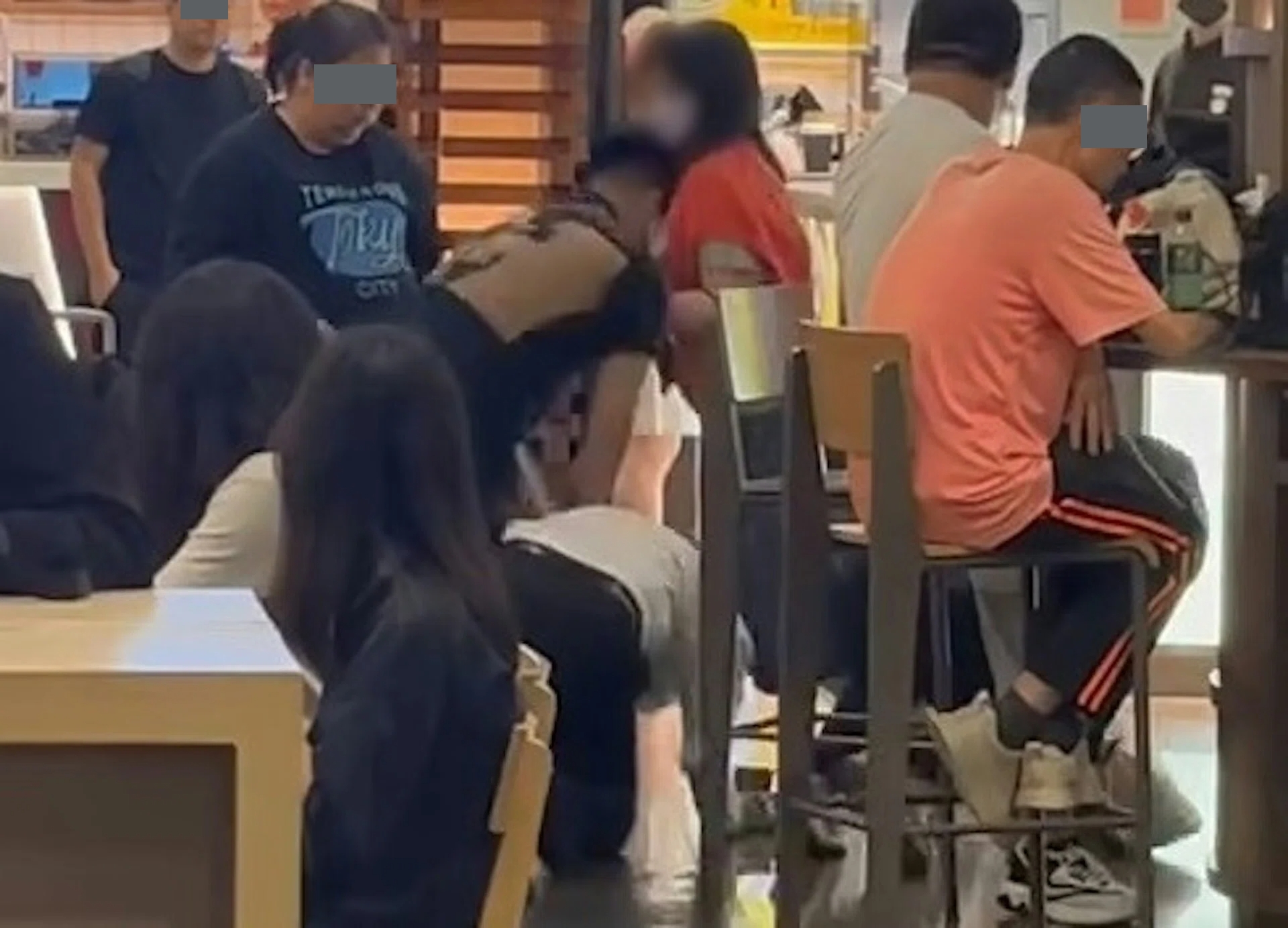 其後港男站起後再衝向黑衫漢,兩人互相推撞,2女則互相拉扯,其中內地婦更出手掌摑港女,最終4人停戰,最後有一名男子上前勸交,「坐低坐低,唔好嘈唔好嘈!」。