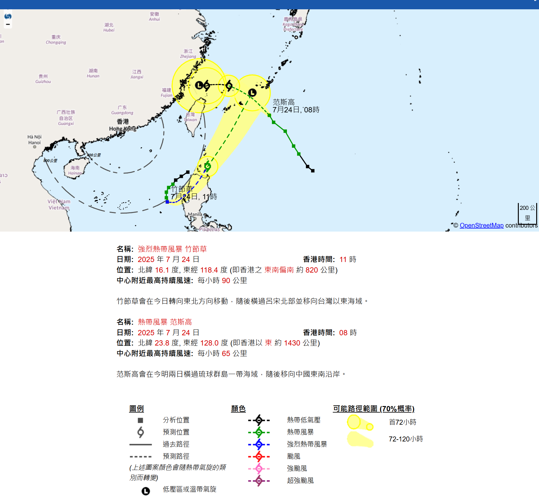 香港天文台今天 (7月24日) 指出,目前兩個熱帶氣旋,分別趨向台灣和琉球。在正午十二時,強烈熱帶風暴竹節草集結在馬尼拉之西北偏西約320公里,預料初時移動緩慢,稍後轉向東北方向移動,時速約18公里,橫過呂宋北部。 同時,熱帶風暴范斯高集結在沖繩島以南約200公里,預料向西北偏西移動,時速約22公里,大致移向琉球群島一帶。