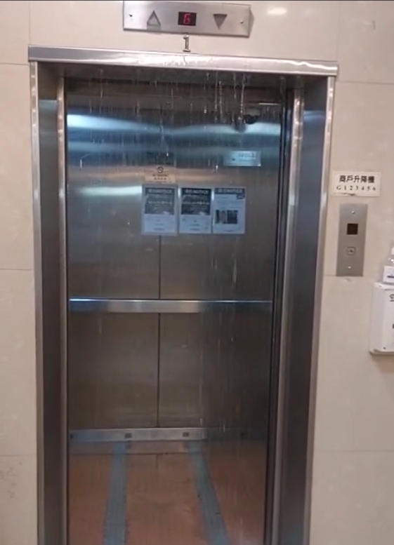該視頻可見香港一楝大廈一部打開𨋢門的升降機,驚變水簾洞由上而下「不停為你滴水!」,現場一名男子疑似正在打電話求助。