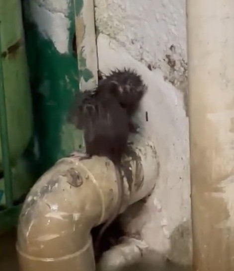 此外,有人拍到黑雨期間,兩隻老鼠依偎在高處避開洪水。