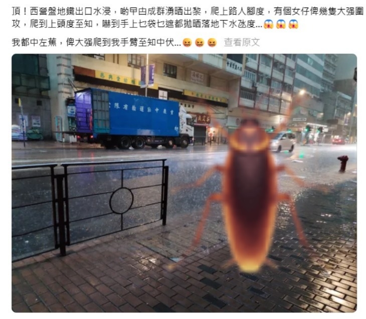 最恐怖要數西營盤的情況,有網民發帖,說西營盤地鐵出口水浸,「西營盤地鐵出口水浸,啲曱甴成群湧晒出黎,爬上路人腳度,有個女仔俾幾隻大强圍攻,爬到上頭度至知,嚇到手上乜袋乜遮都拋晒落地下水氹度…」