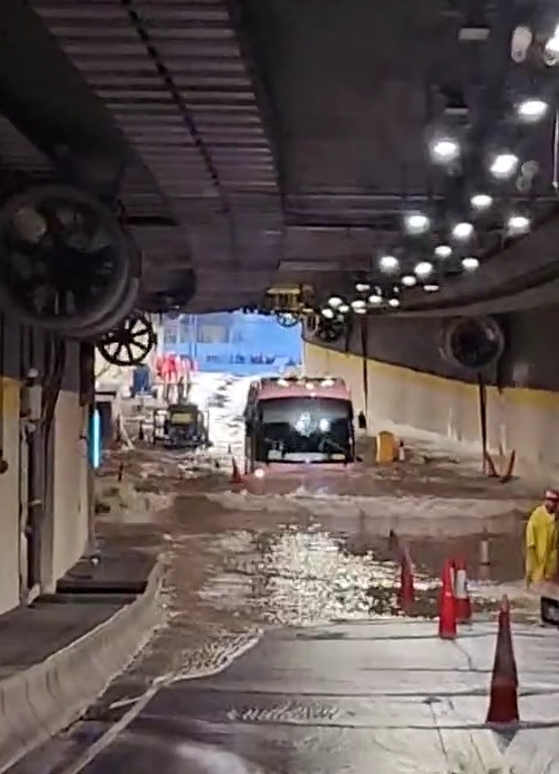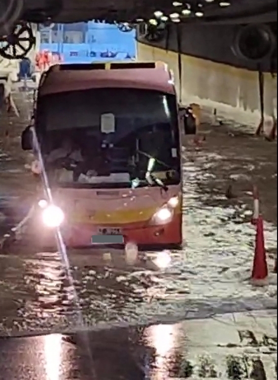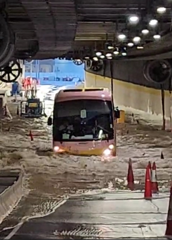 事發時間相信是今天黑雨期間,地點則相信為機場三跑一帶的行車隧道內。視頻可見一輛大巴「潛水」式涉水而行,驚險硬闖水浸的隧道,場面震撼,期間旁白者也為之動容。